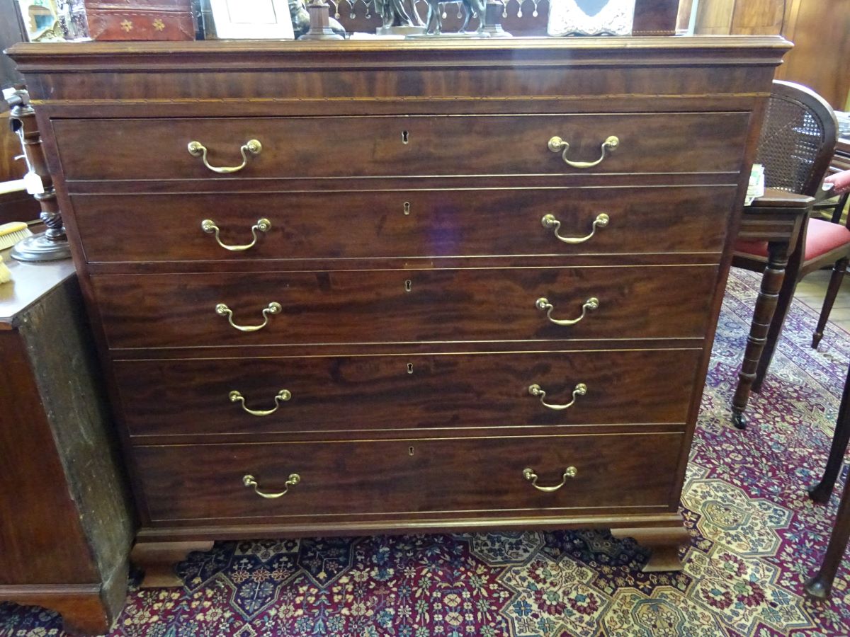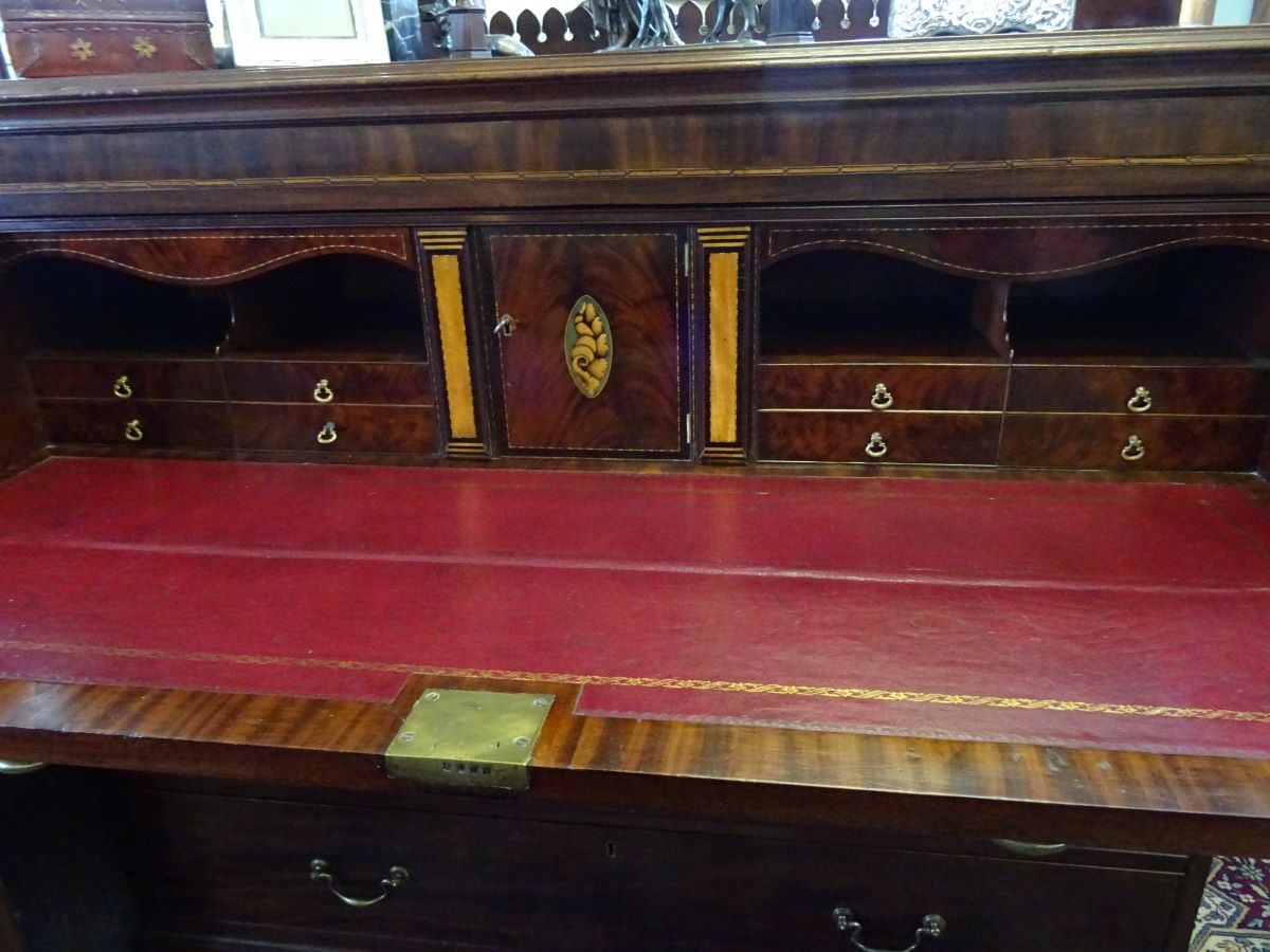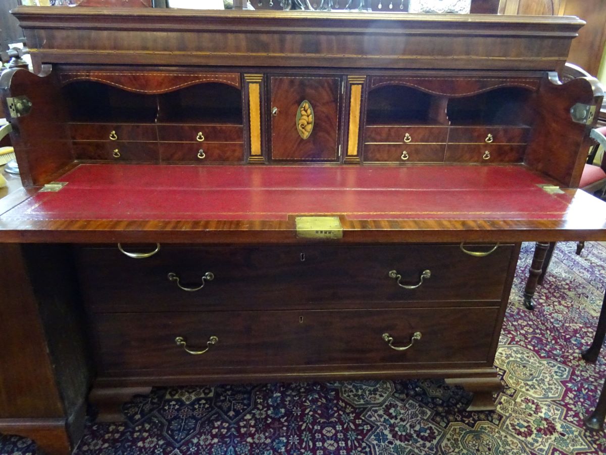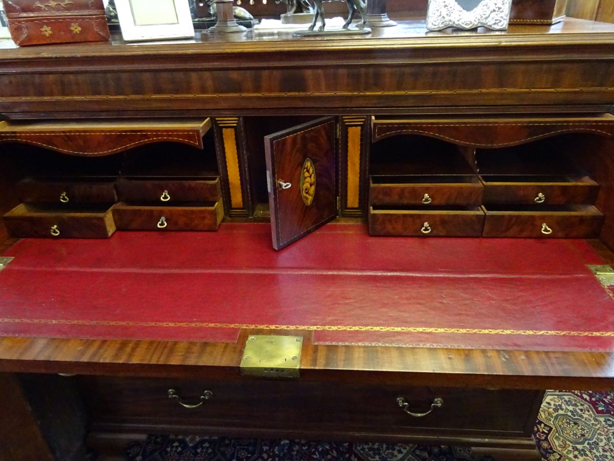 Here is a good mahogany secretaire chest of drawers, the top drawer fitted with leather skiver, inlaid cupboards and drawers. There are 3 long drawers below. Stands on ogee bracket feet. Excellent condition, measures 4'1'', 3'10'' high.