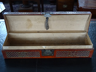 Here is an antique Chinese scroll box covered with gilded leather, measuring 20 inches long. Good condition.
