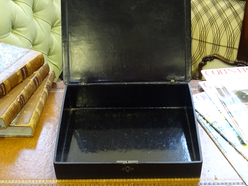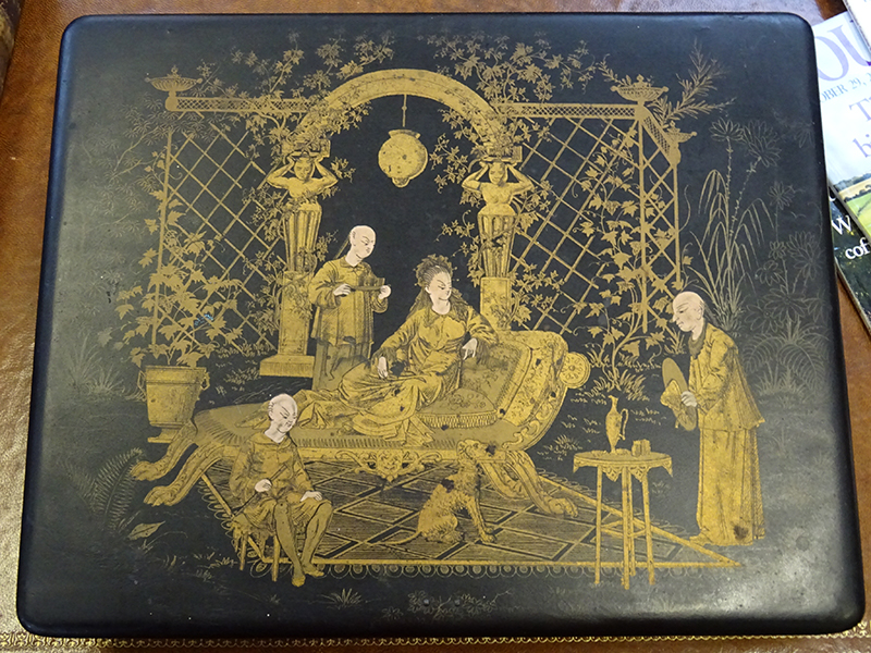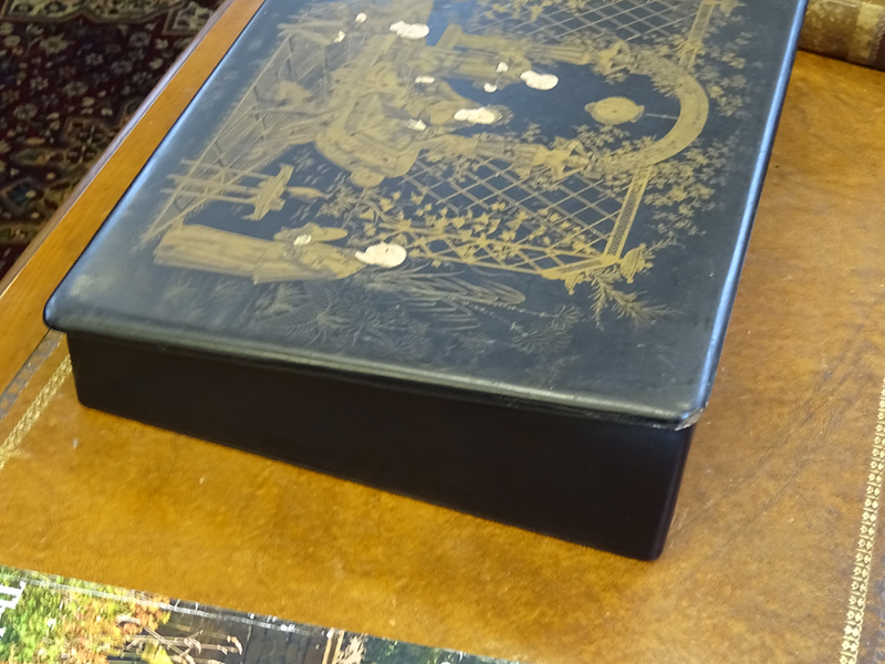 Here is an antique lacquered box with painted and gilded chinoiserie scene to the lid. Good condition and measures just over 12 inches wide and 10 inches in depth.