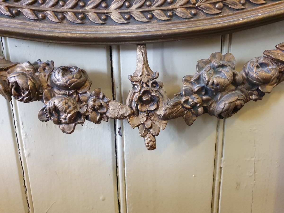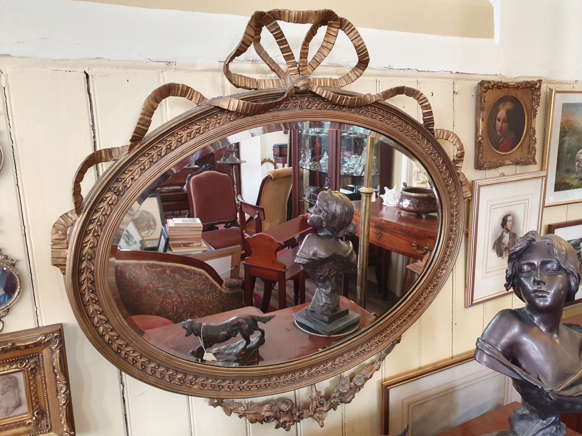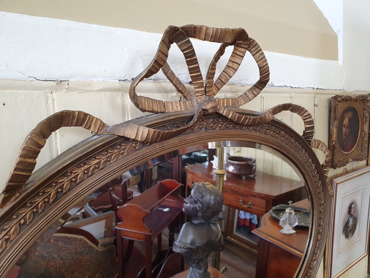 • An antique Oval Gilt Gesso Framed Wall Mirror With Ribbon Pediment