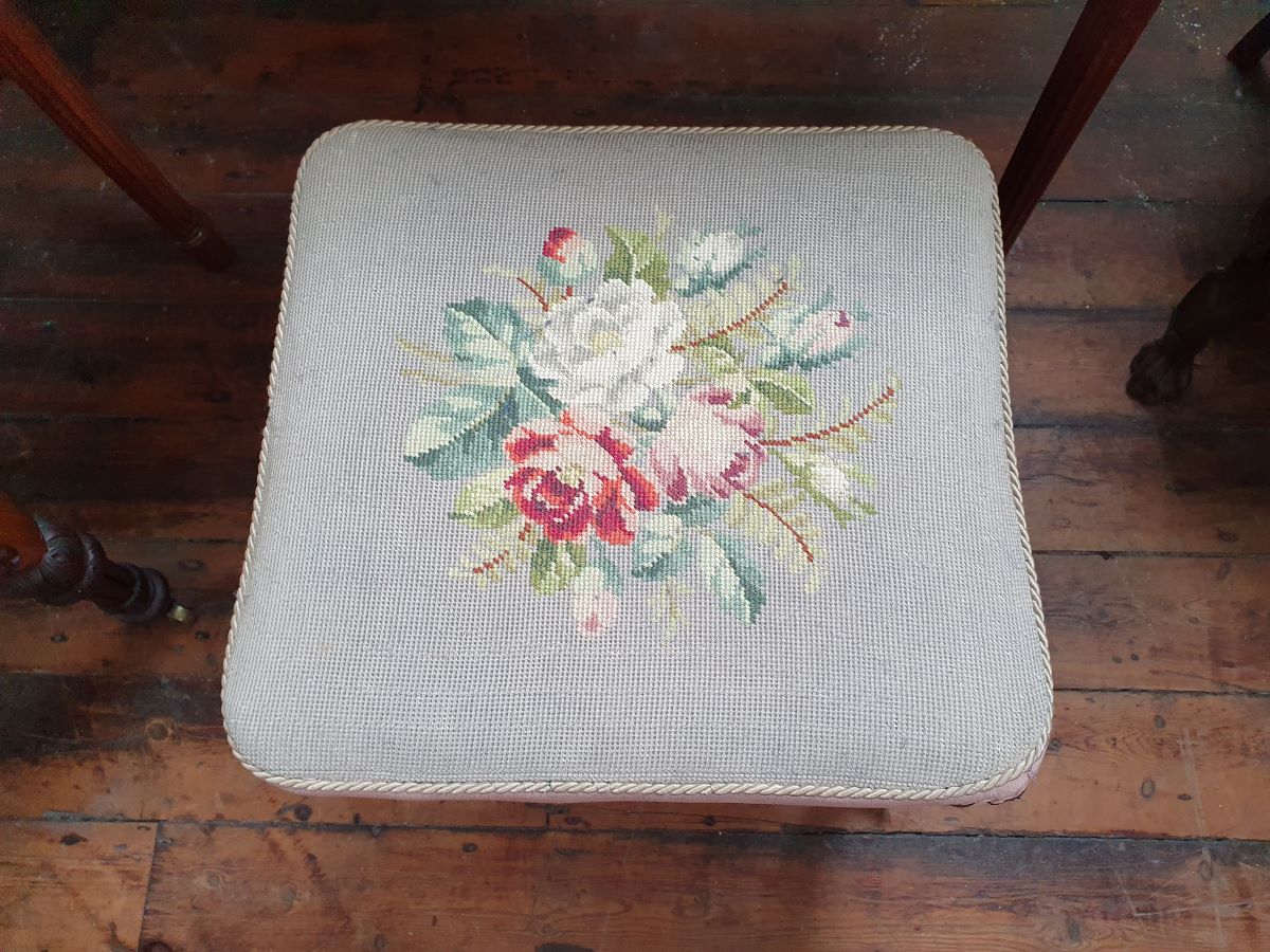 Standing on cabriole legs, upholstered with tapestry cover. Height 18'', Seat measures 18'' x 16½''.