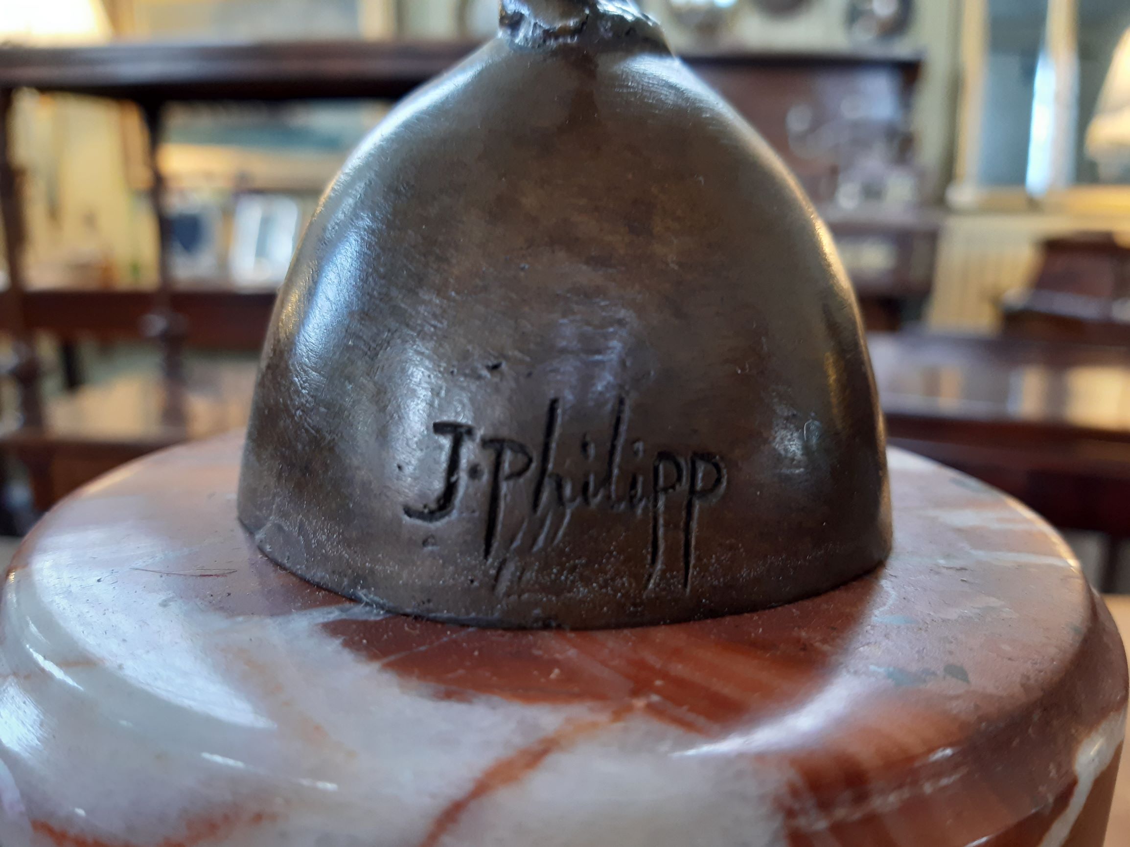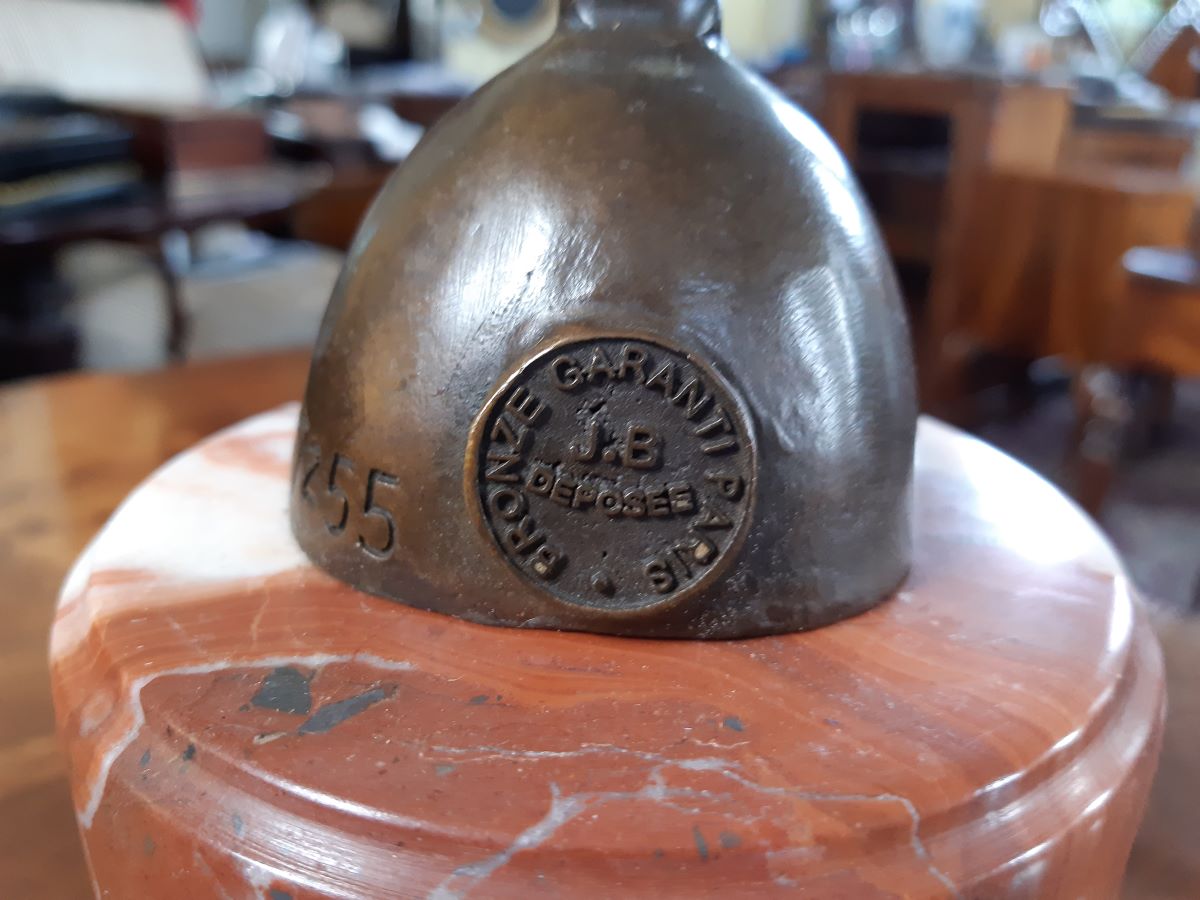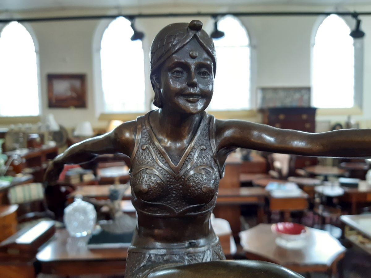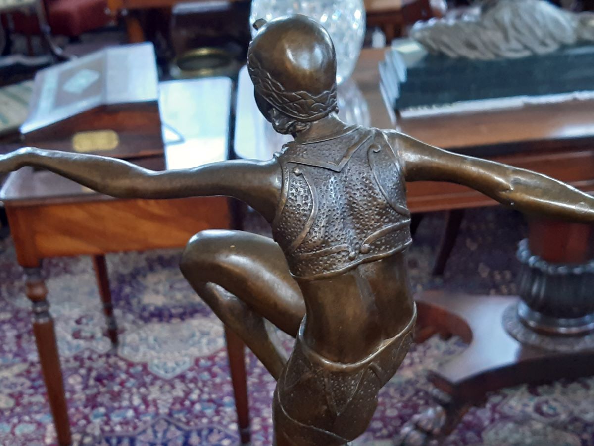 Here is a large bronze figure of an art deco female dancer, standing on a marble base. Foundry mark.