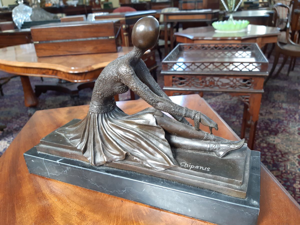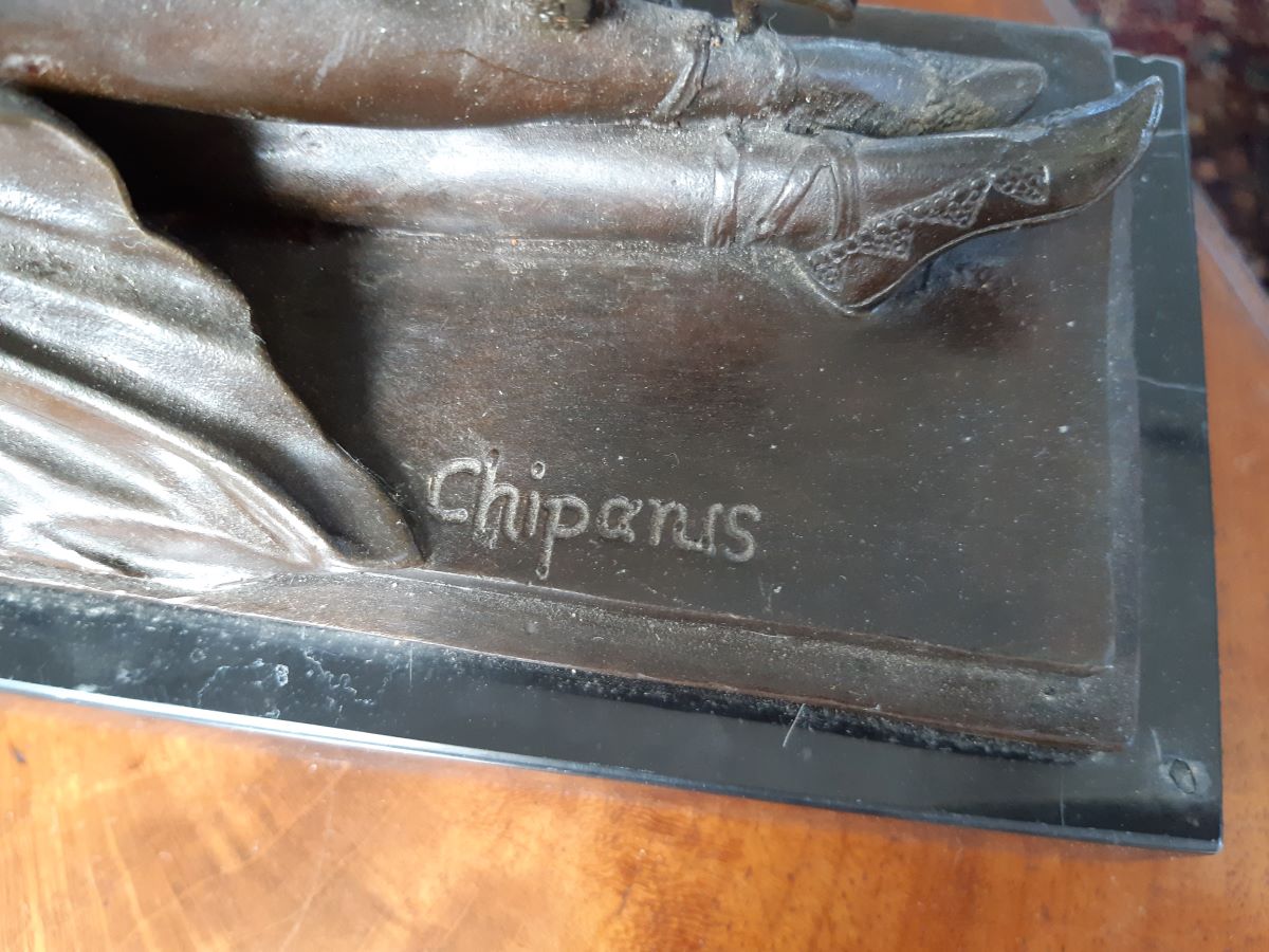 Here is a bronze figurine of a dancer resting on a marble base, signed Chiparus. Measures 11½''.
