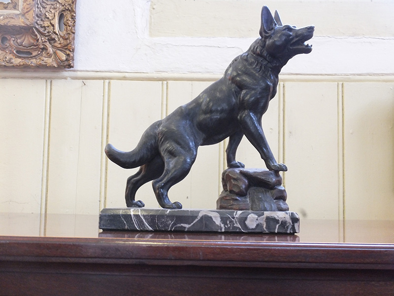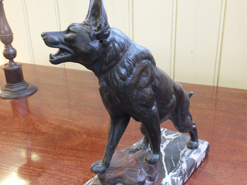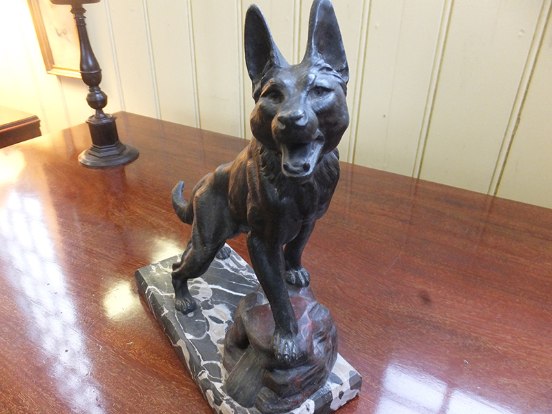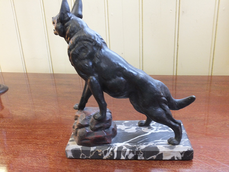 Here is an Alsatian dog made from Spelter in the 1930's and mounted on a marble base. It stands just under 10 inches high and the base is 8 inches wide. Good condition.