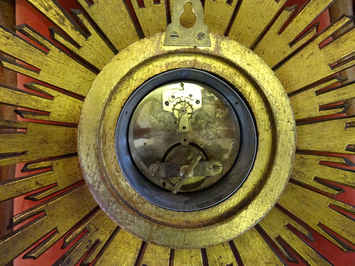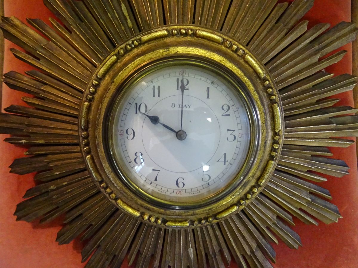 Here is a wooden sunburst clock, French from the Art Deco Period.