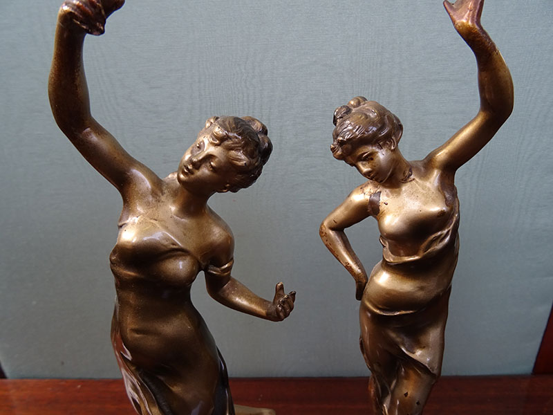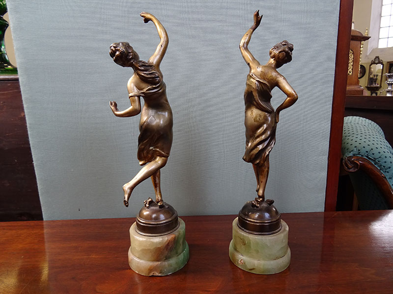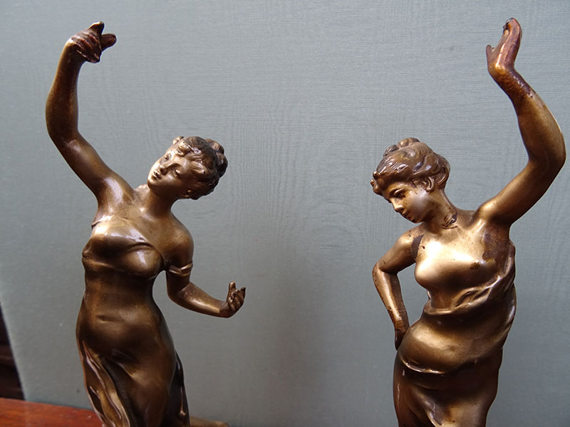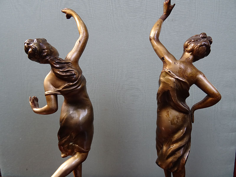 Pair of bronze patinated spelter young ladies standing on marble bases.