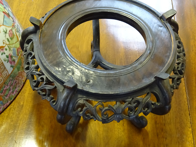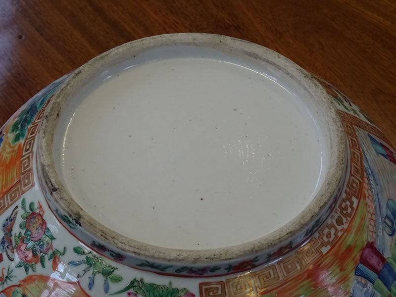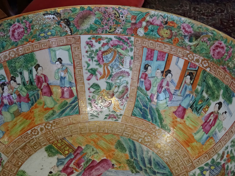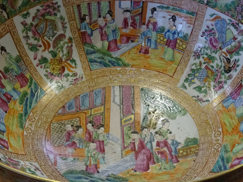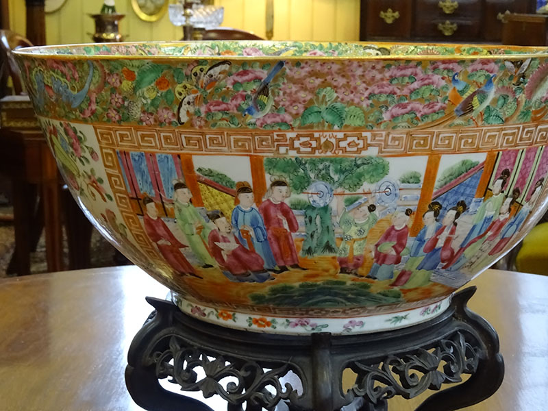 Here is a 19th.century Chinese Famille Rose bowl, hand painted enamel panels, court scenes, children, gilded bird and butterfly decorated borders. Measures 15 inches in diameter, 6.5 inches high. Stands on original carved and pierced hardwood stand. Overall height, 12 inches. Excellent condition.