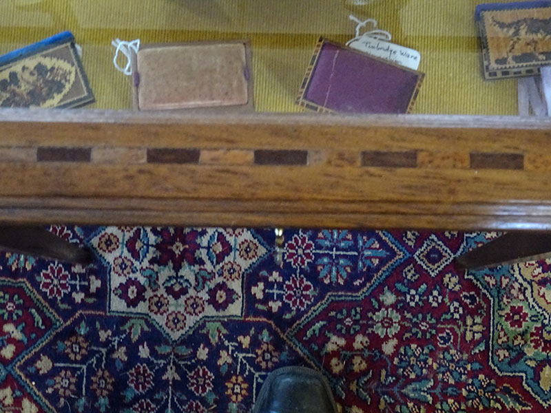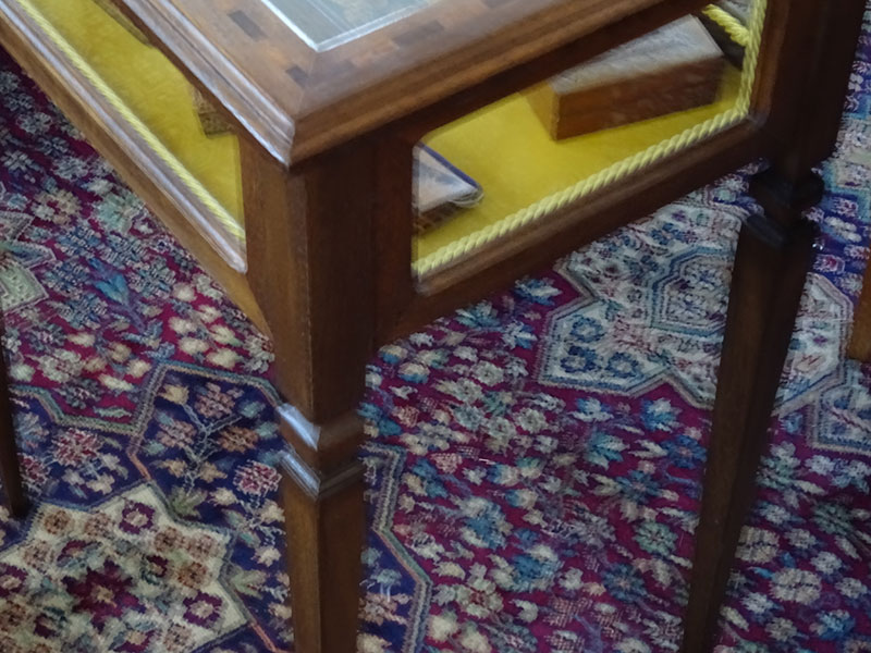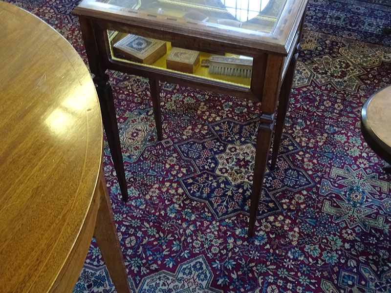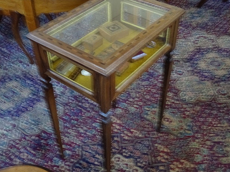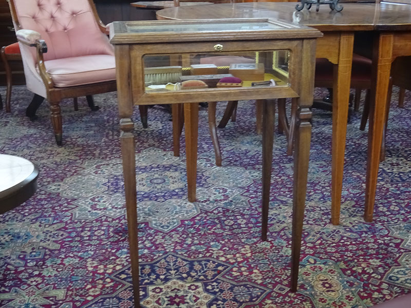 Here is a fine mahogany Edwardian Bijouterie table. Having a rectangular glazed top with inlaid detail which opens. Inside is a gold lining. Stands on square tapering legs. Measures 20 inches long, 14 inches deep, 30 inches high.