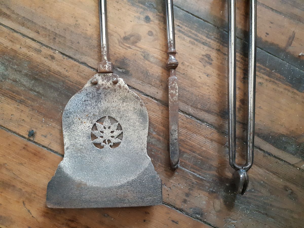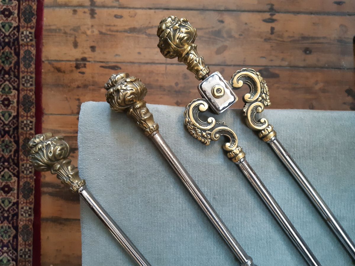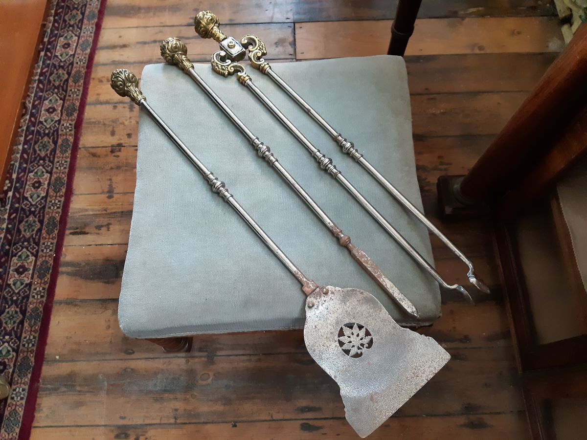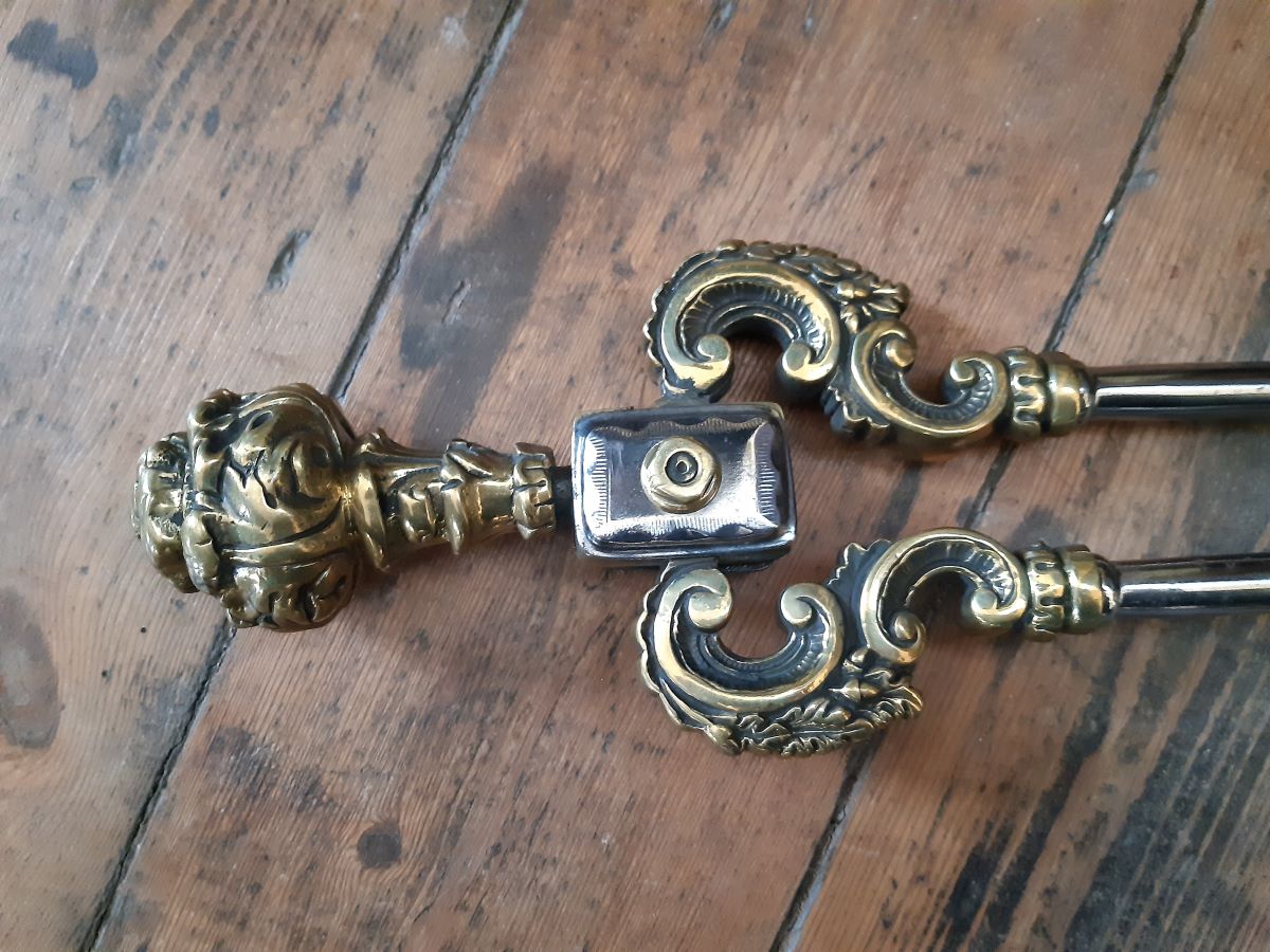 Here are a fine brass-mounted steel 3-piece fire companion set, from the early 19th century. They measure 28'' long.