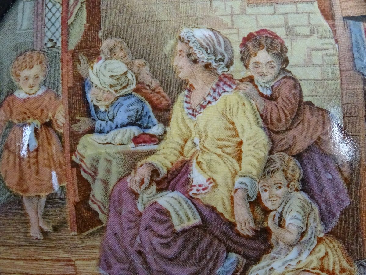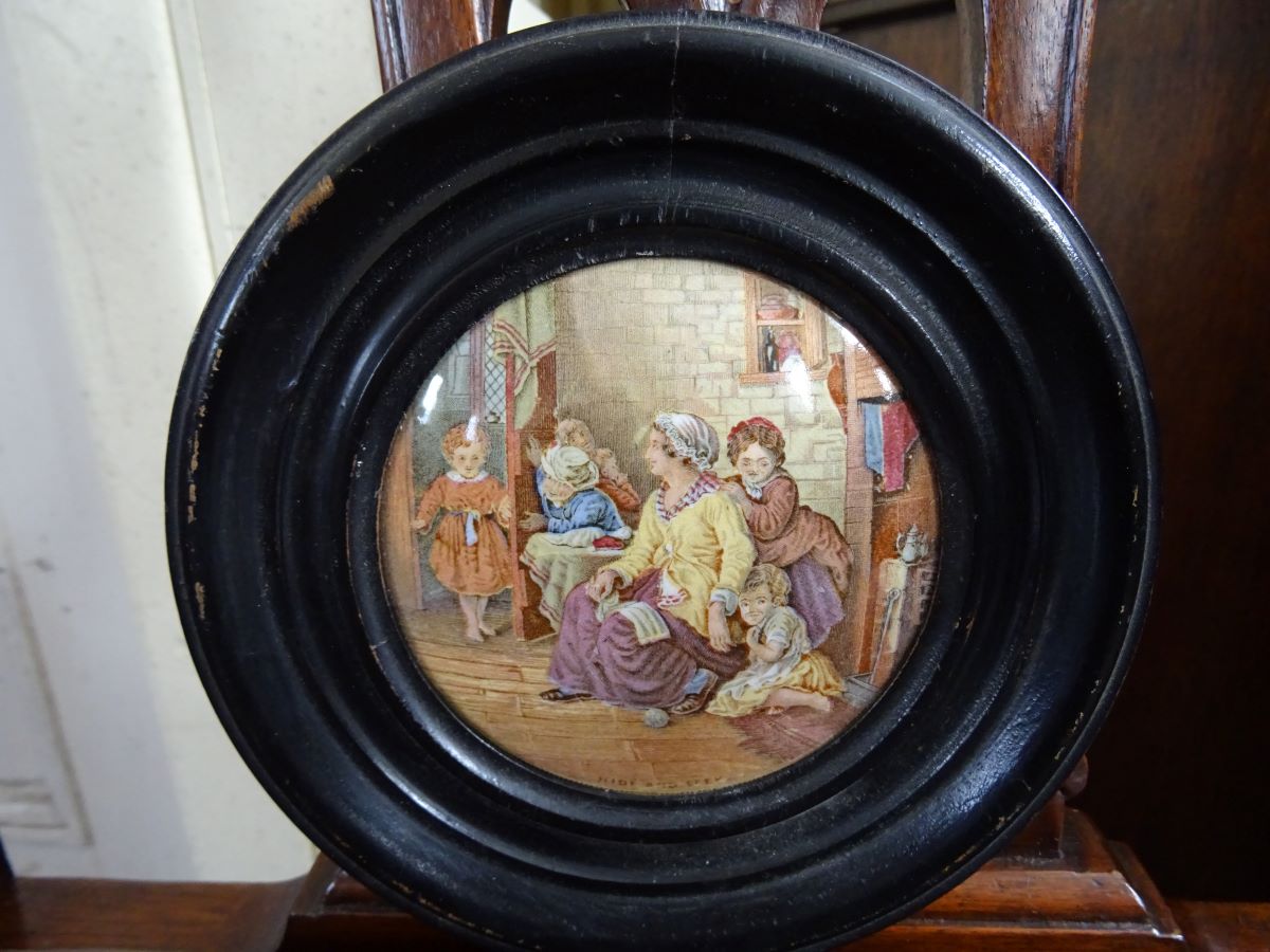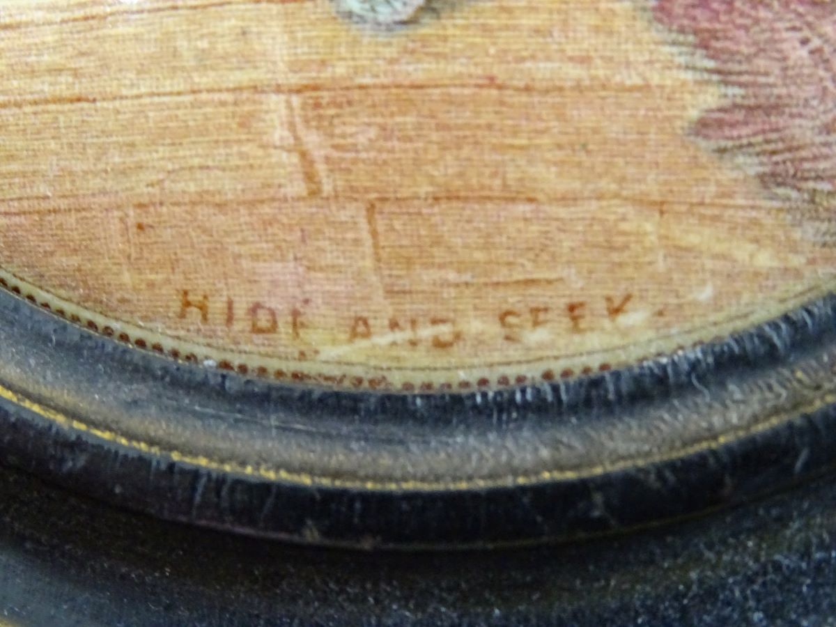 Here is a 19th century Prattware pot lid, 'Hide & Seek. Encased in a round ebonised frame.