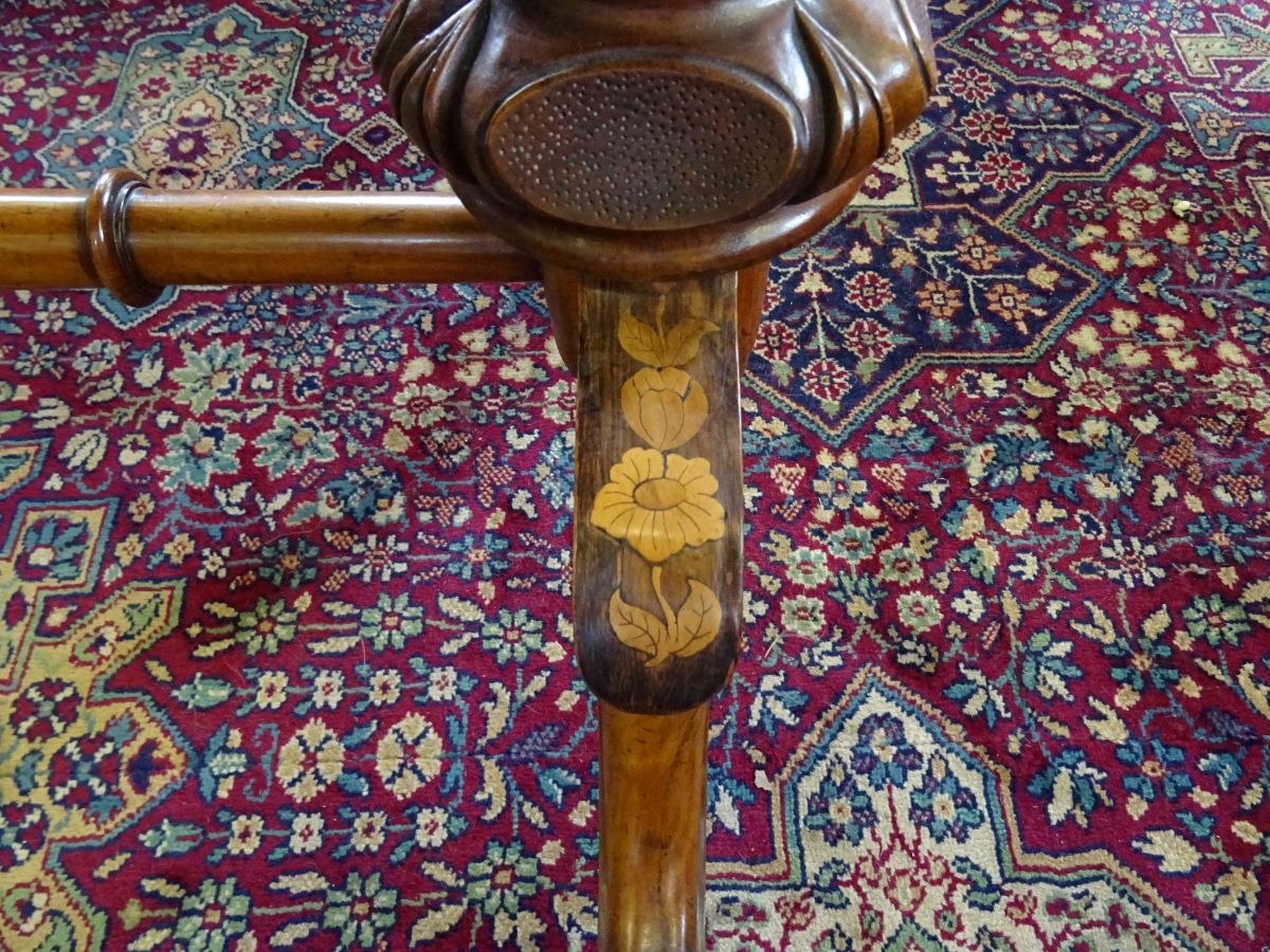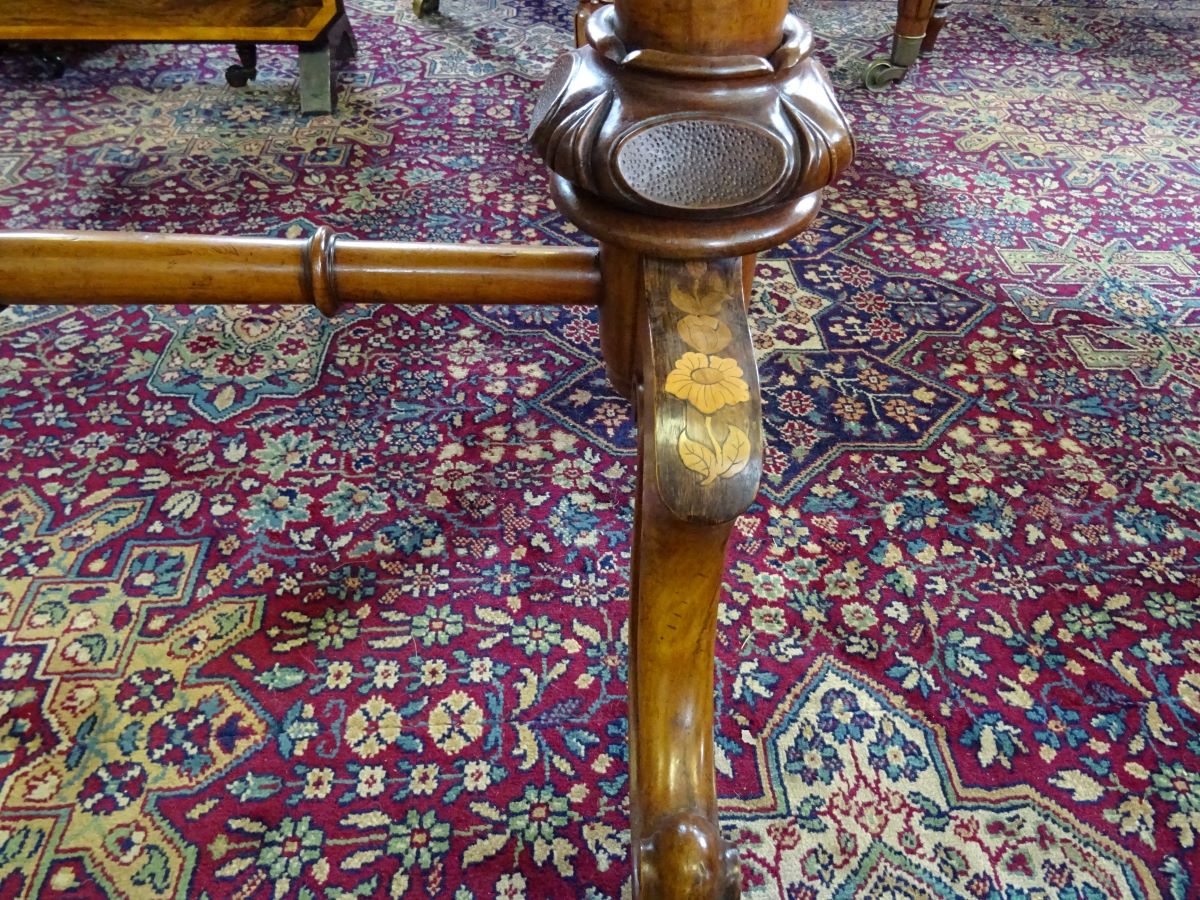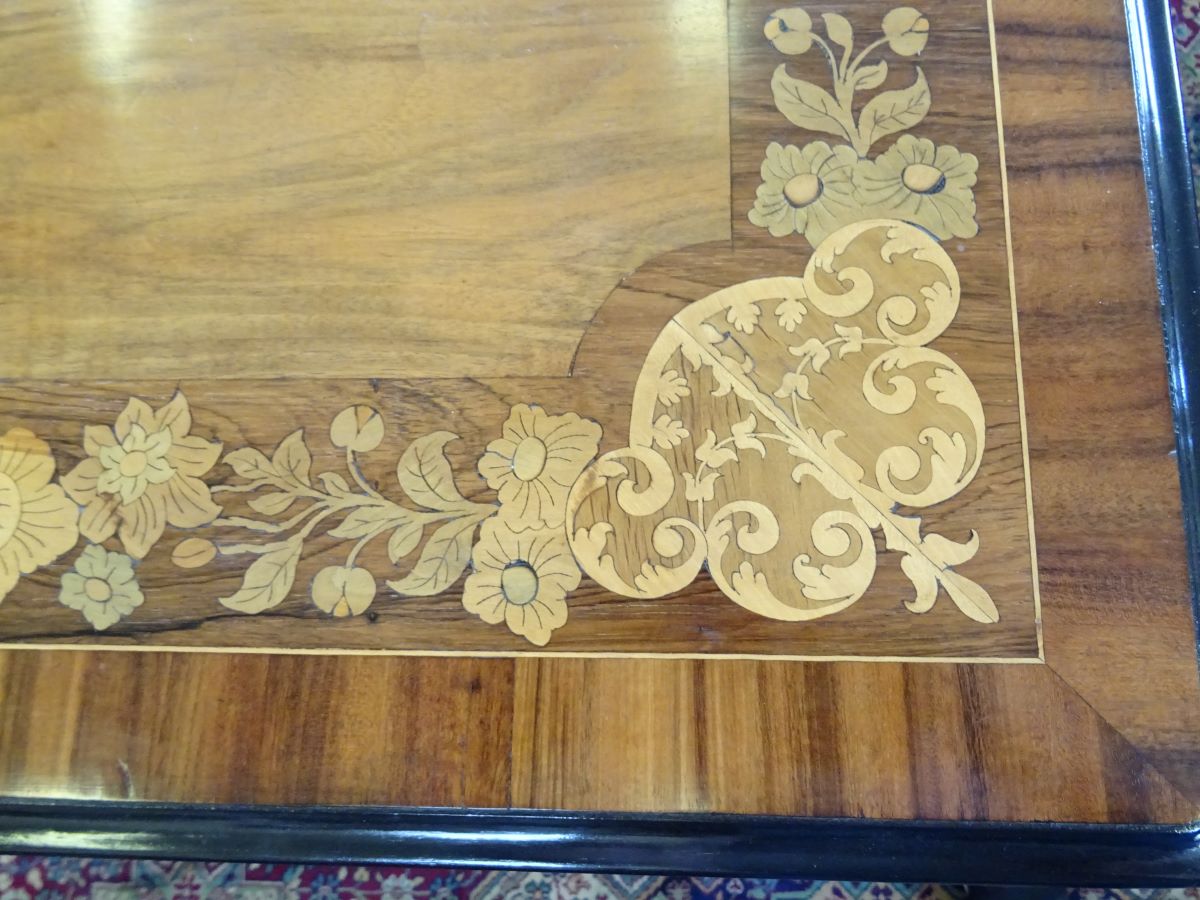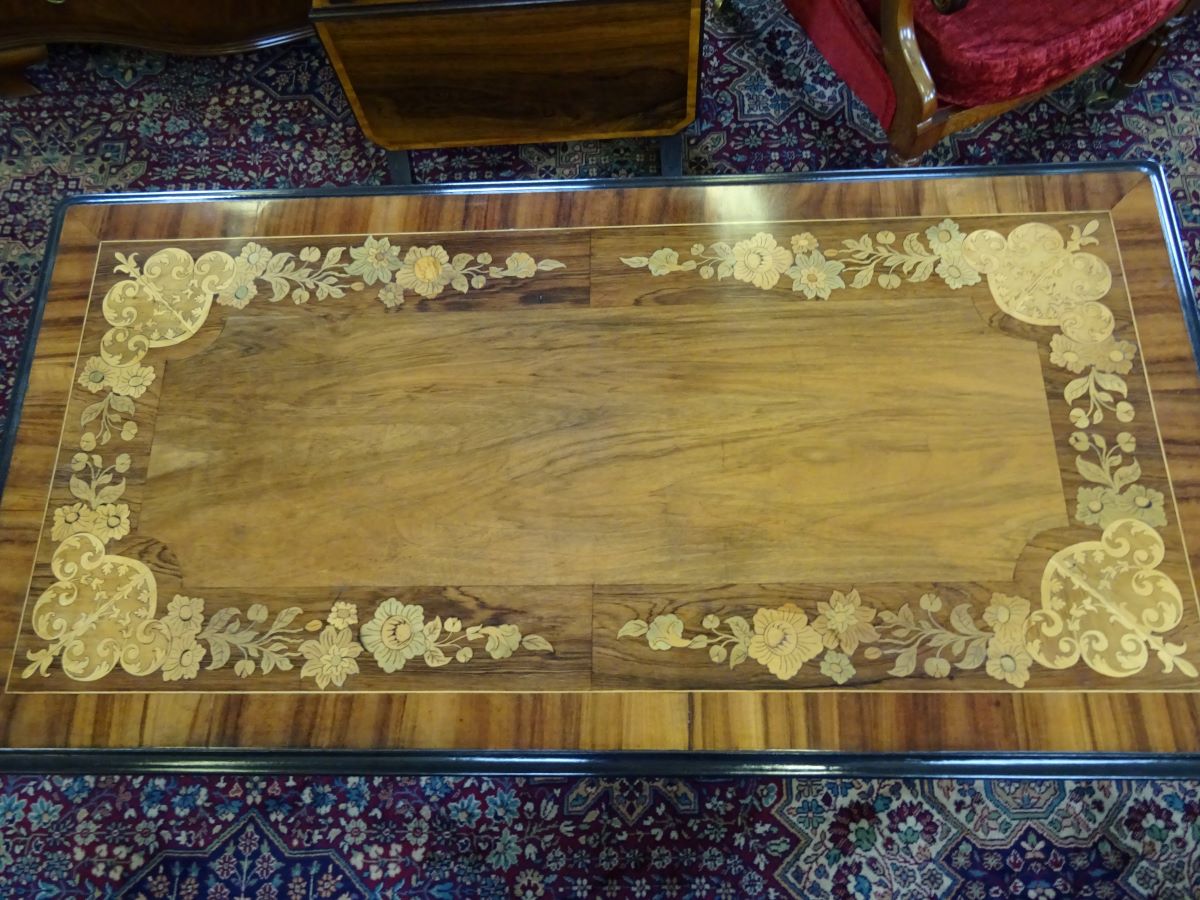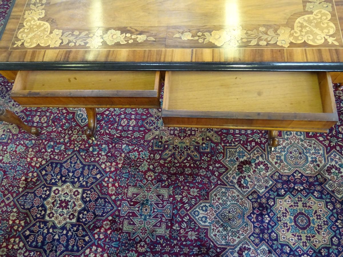 Here is a fine early Victorian walnut and rosewood stretcher writing table. The top is rosewood cross banded with floral marquetry inlay, with 2 frieze drawers, standing on a carved base, Excellent condition and measures 3'5'' wide, 21'' deep.