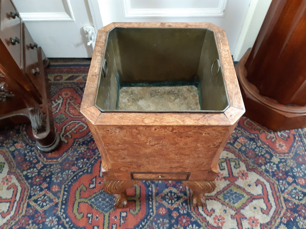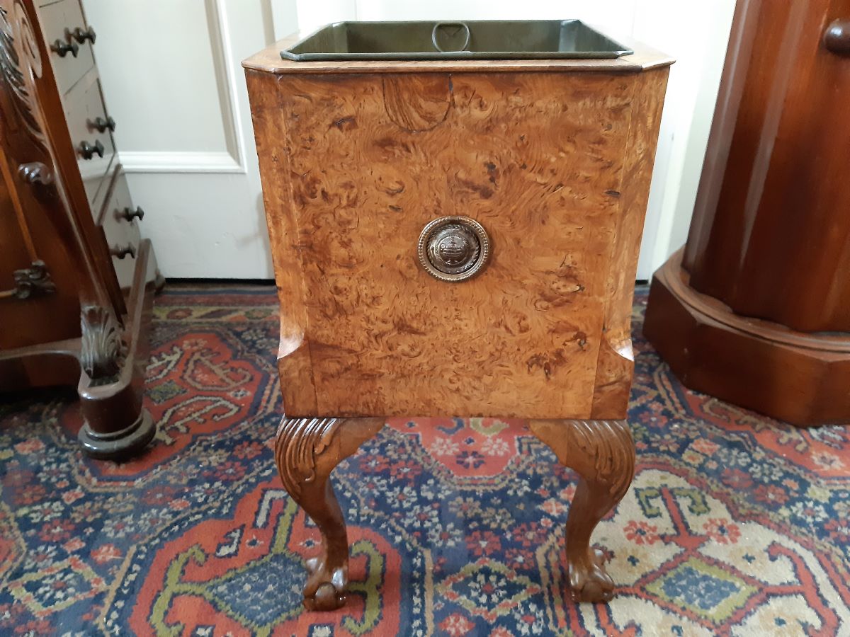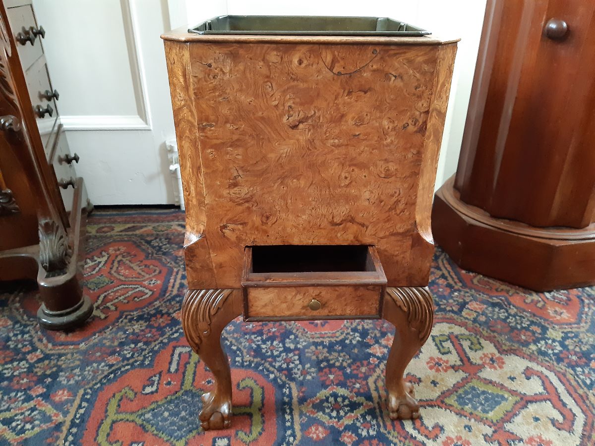 Here is a burr walnut jardiniere, complete with metal liner, drawer under, stands on ball and claw feet with two brass carrying handles. C.1900, Measures 12'' square, 20'' high. Very good condition.