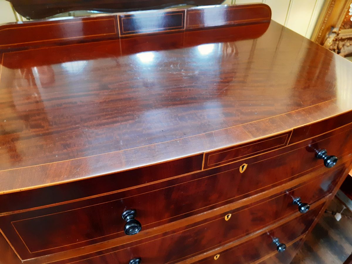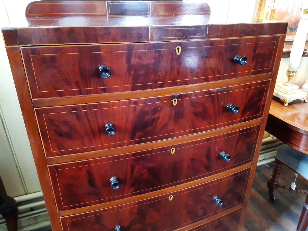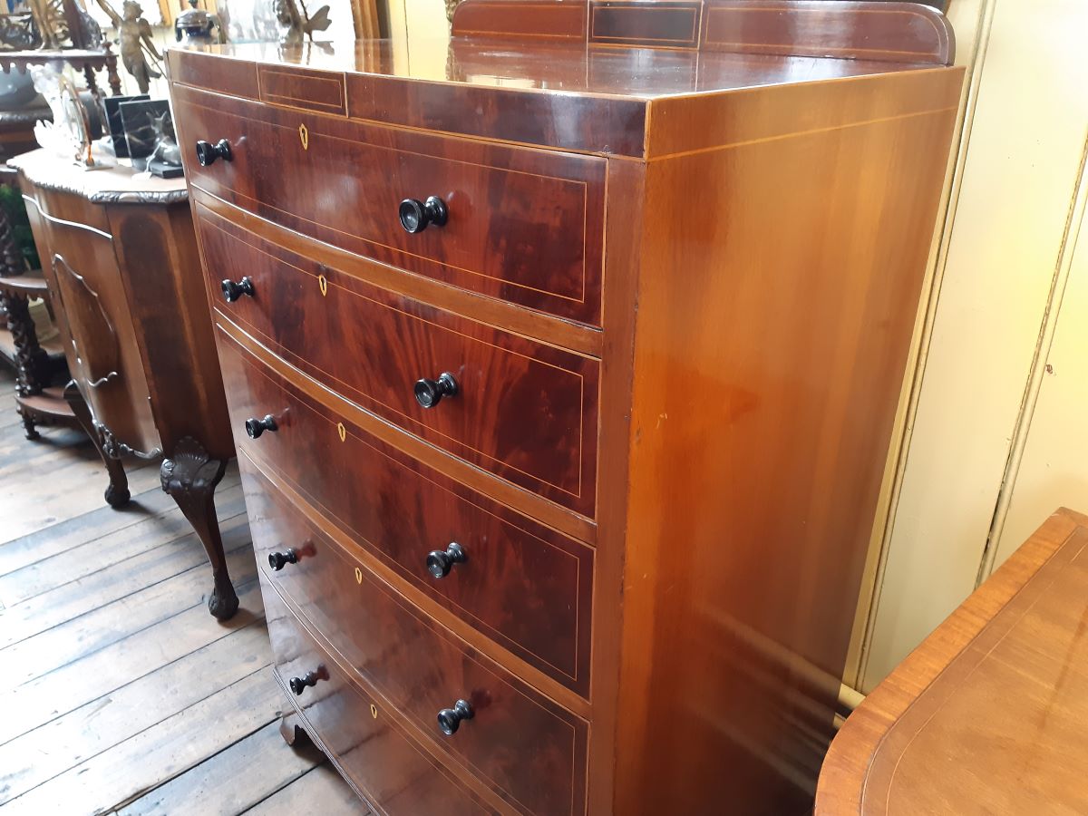 Here is a good quality strung bowfront chest of long drawers with turned ebony handles, stands on bracket feet. Excellent condition. Measures 3'7'' high, 30'' wide.