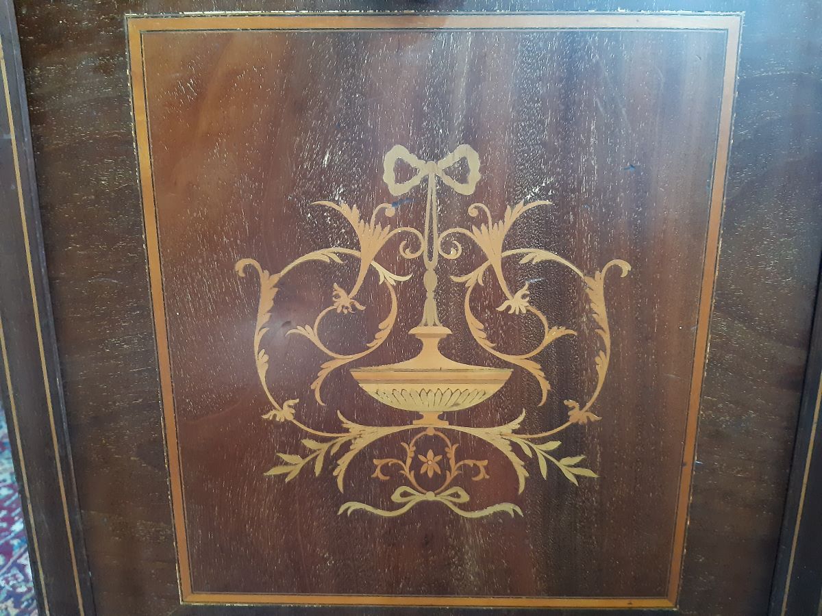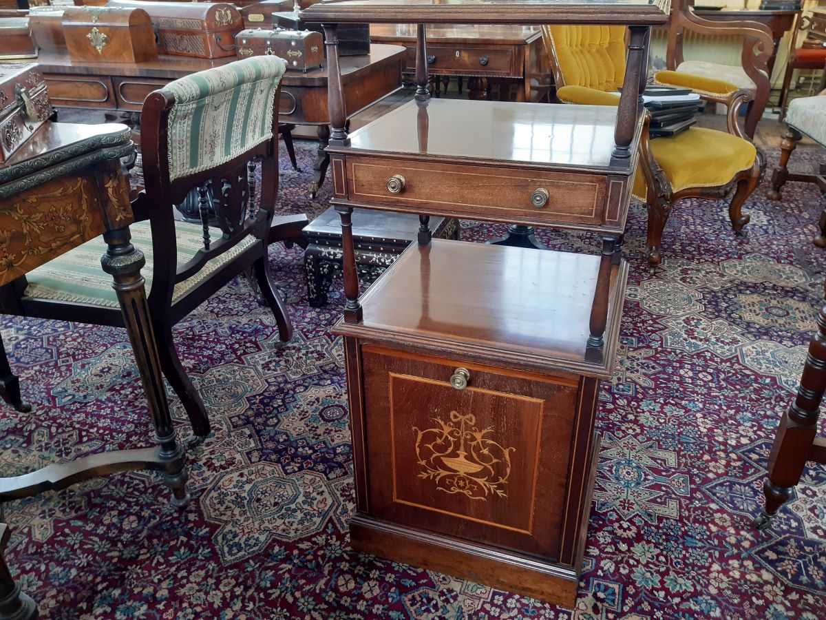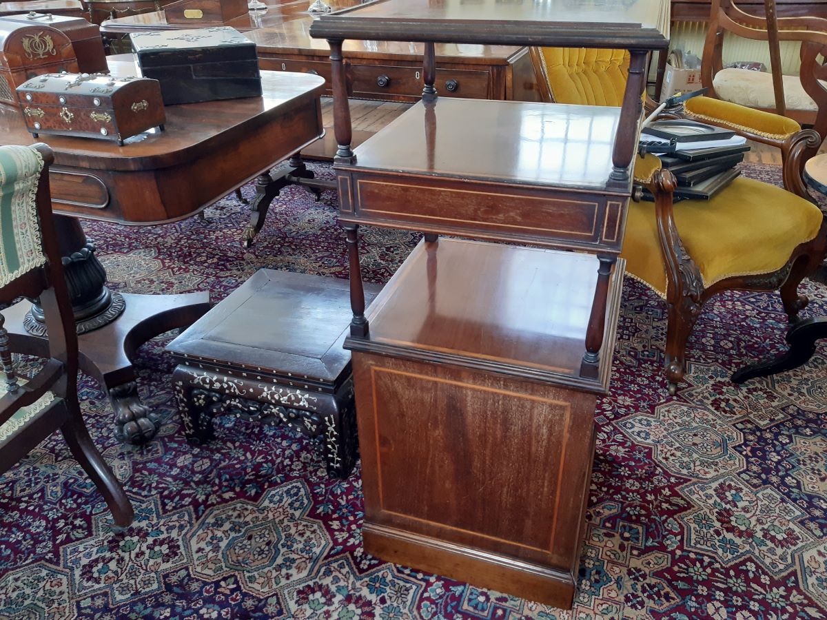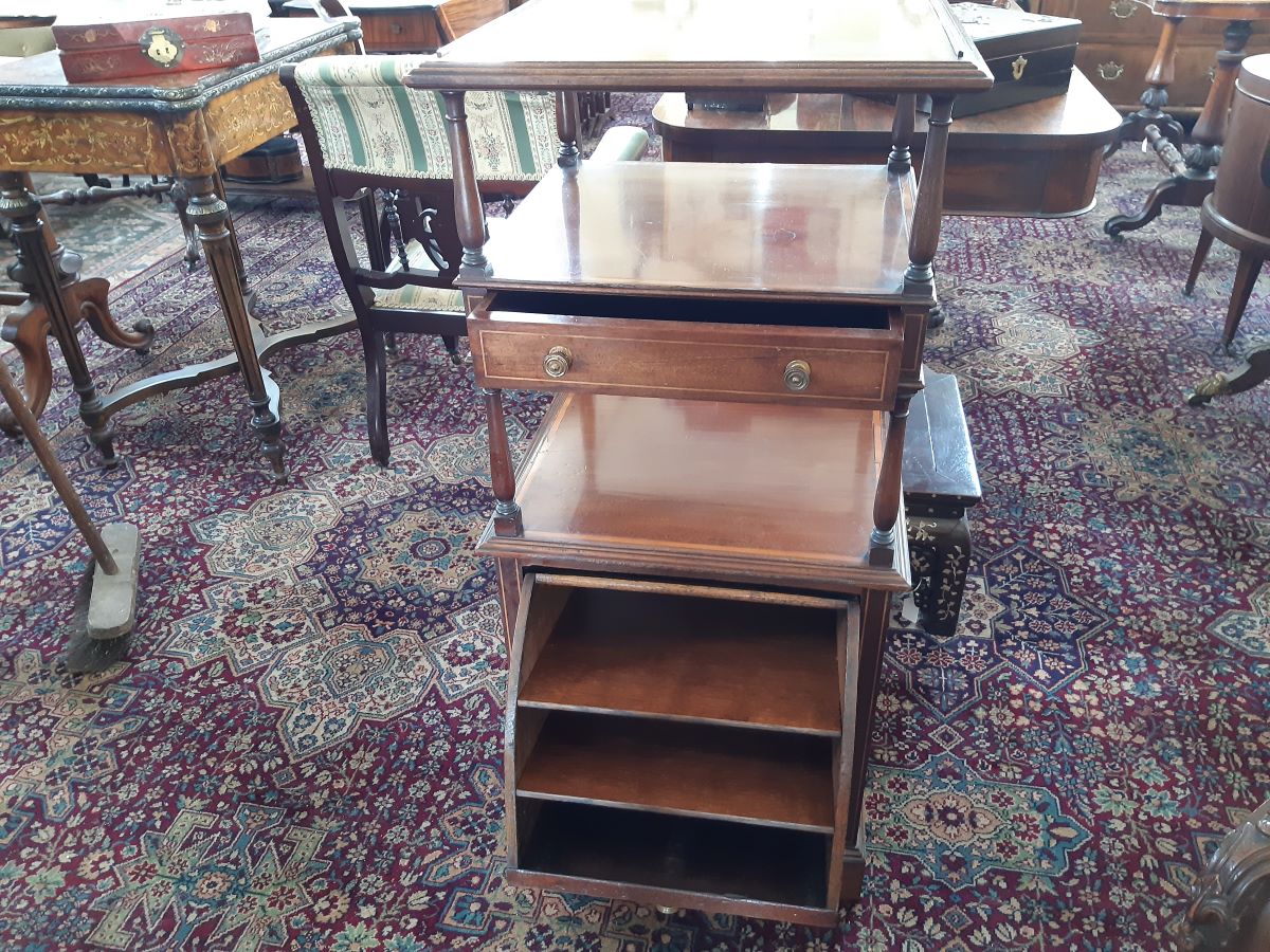 Here is a mahogany canterbury , 3 shelf, 1 with drawer whatnot. Comprising a full front cupboard fitted for magazines etc, stands on a plinth base, door inlaid and fitted brass handle. Measures 1'5'' wide , 14'' deep, 3'1'' high.
