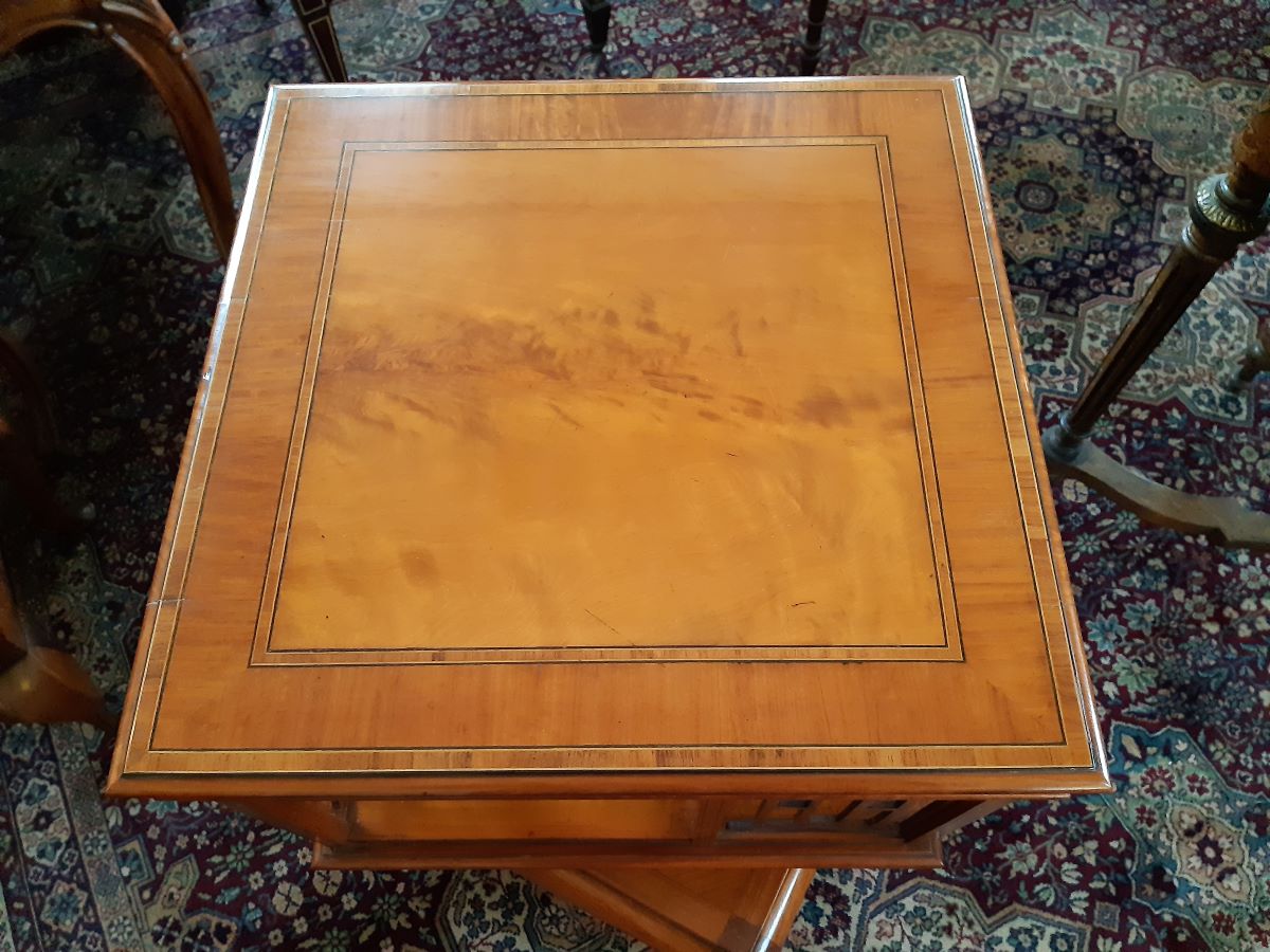 Here is a good quality square satinwood revolving bookcase with crossbanded top and fretwork panels. It stands on cabriole legs with shaped shelf. Top measures 18'' square and the whole stands 31''. Excellent condition.