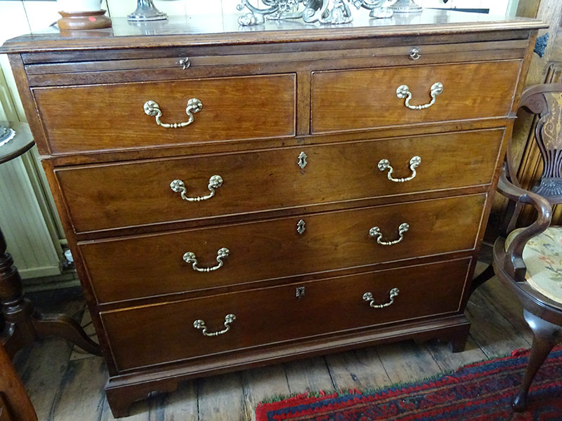 Here is a good solid mahogany chest of 3 long and 2 short drawers, oak lined, fitted with brass handles and escutcheons. Complete with brushing slide. From the late Georgian period it stands on bracket feet. Measures 3' 7'' wide, 1' 10'' deep, 3' 4'' high.