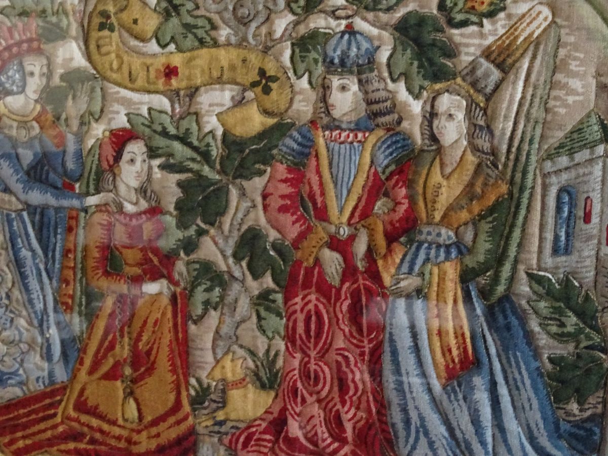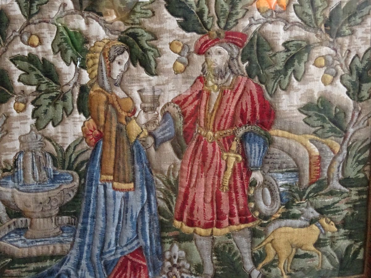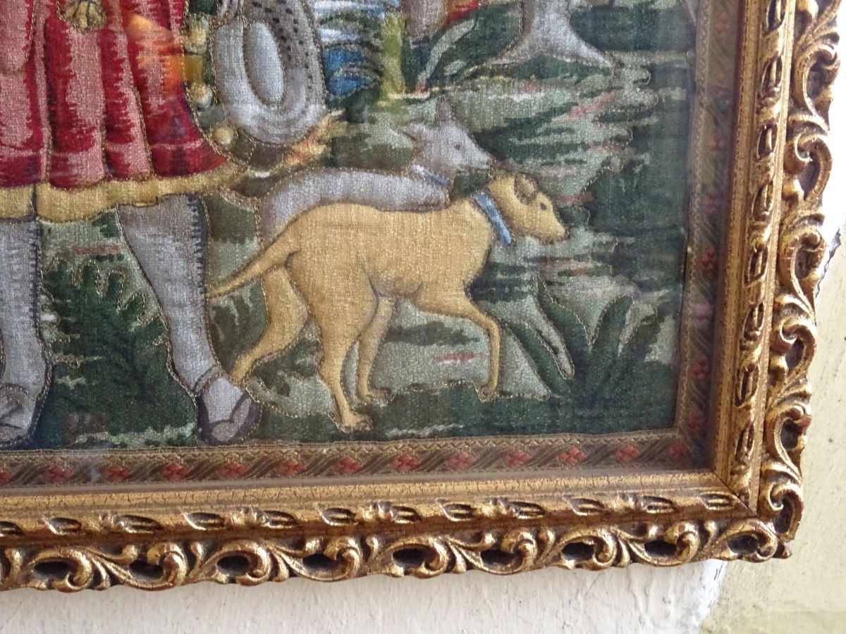 An embroidered wall panel in a gilt frame which measures 22.5''x 47''.