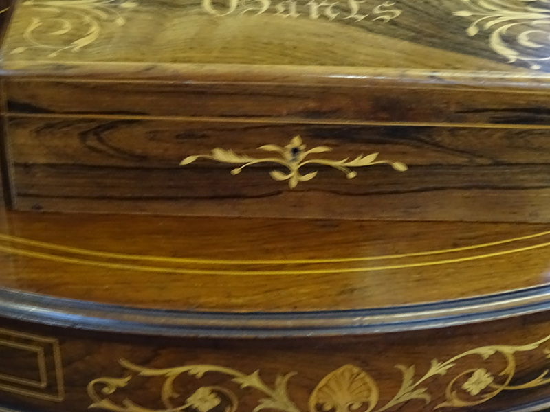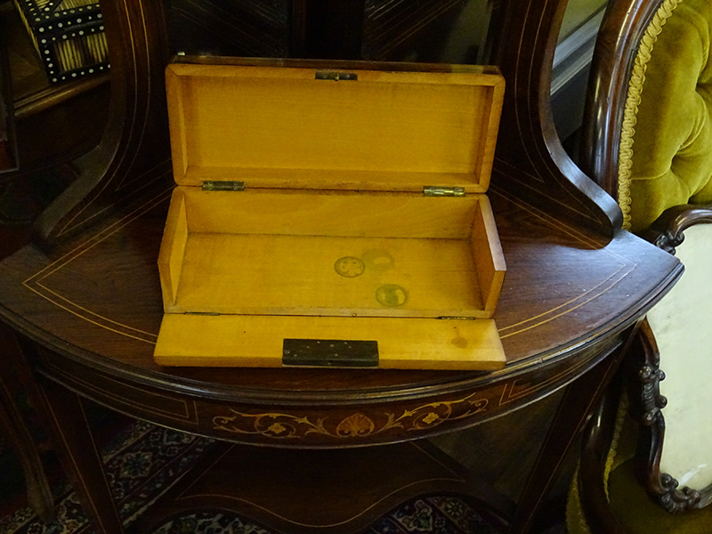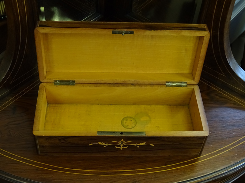 Here is a French glove box, rosewood, nicely inlaid, fall front, makers label under base. Measures just over 10 inches long.