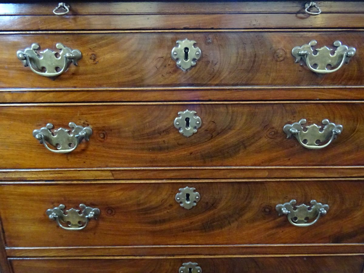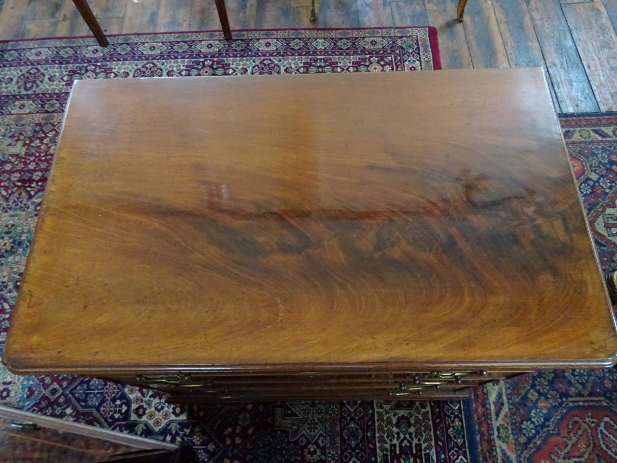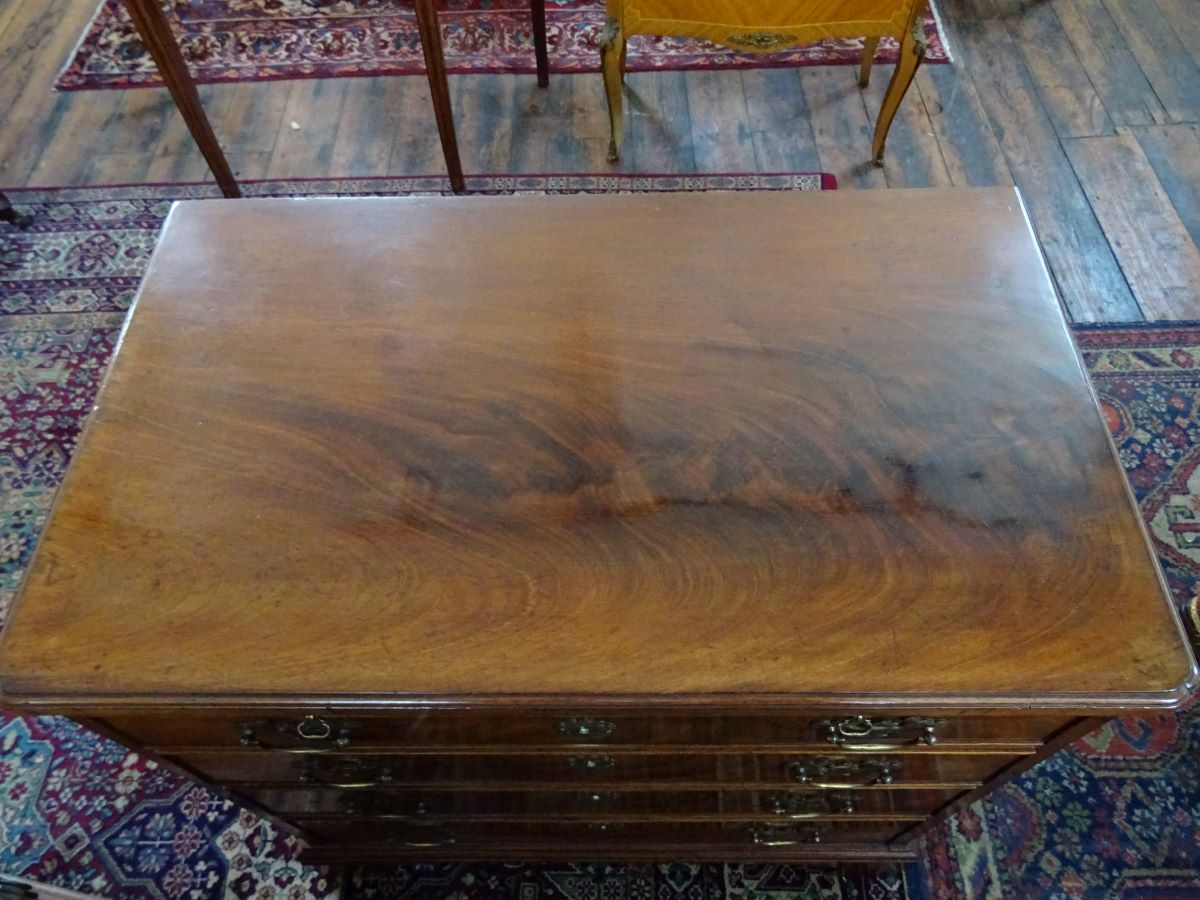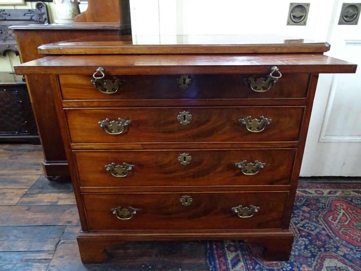 Here is a good George 111 period mahogany batchelor's chest, fitted with 4 long drawers which have brass handles , above which is a brushing slide. The chest sits on bracket feet and measures only 2'6'' wide and 2'6'' high.