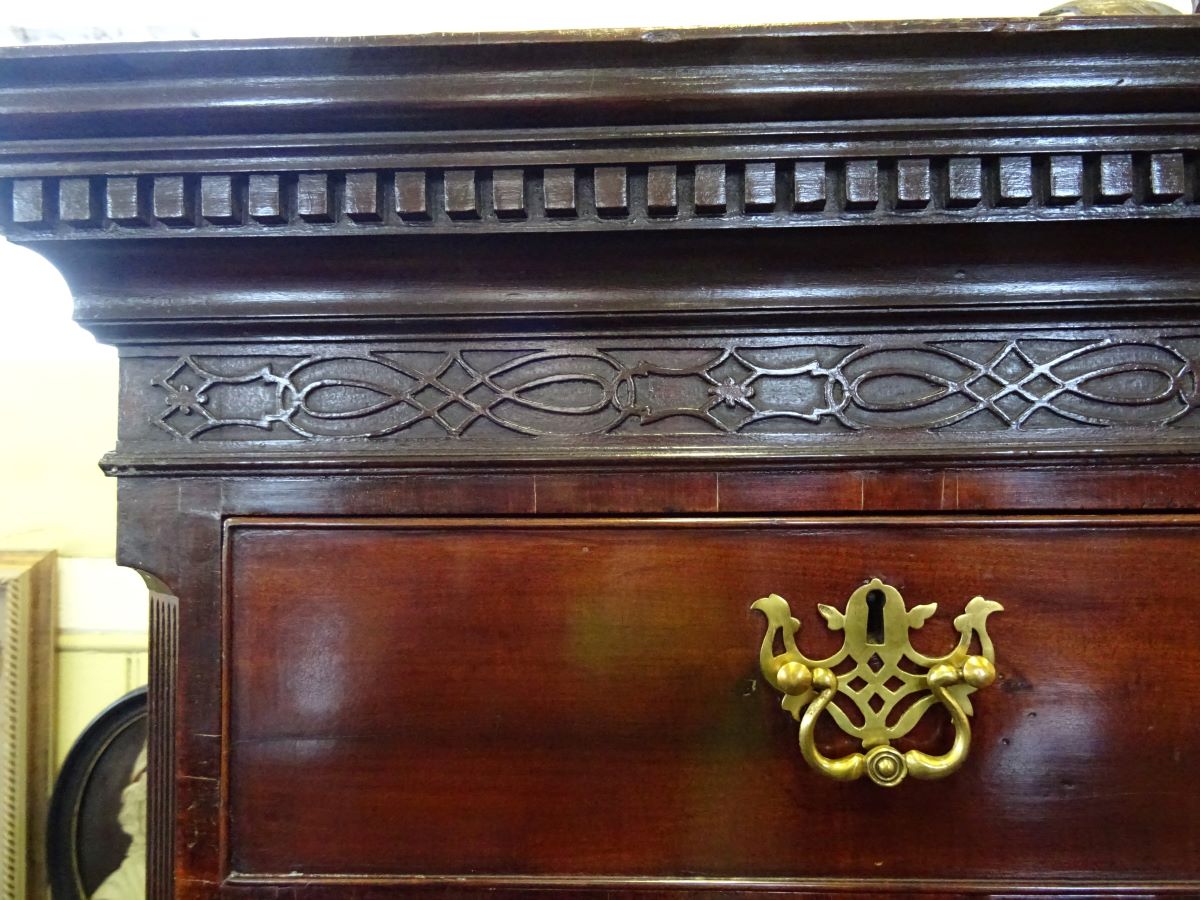 Here is a good mahogany chest on chest with dentil moulded top, reeded canted corners and brushing slide. Measures 3' 7'' wide, 6' high.
