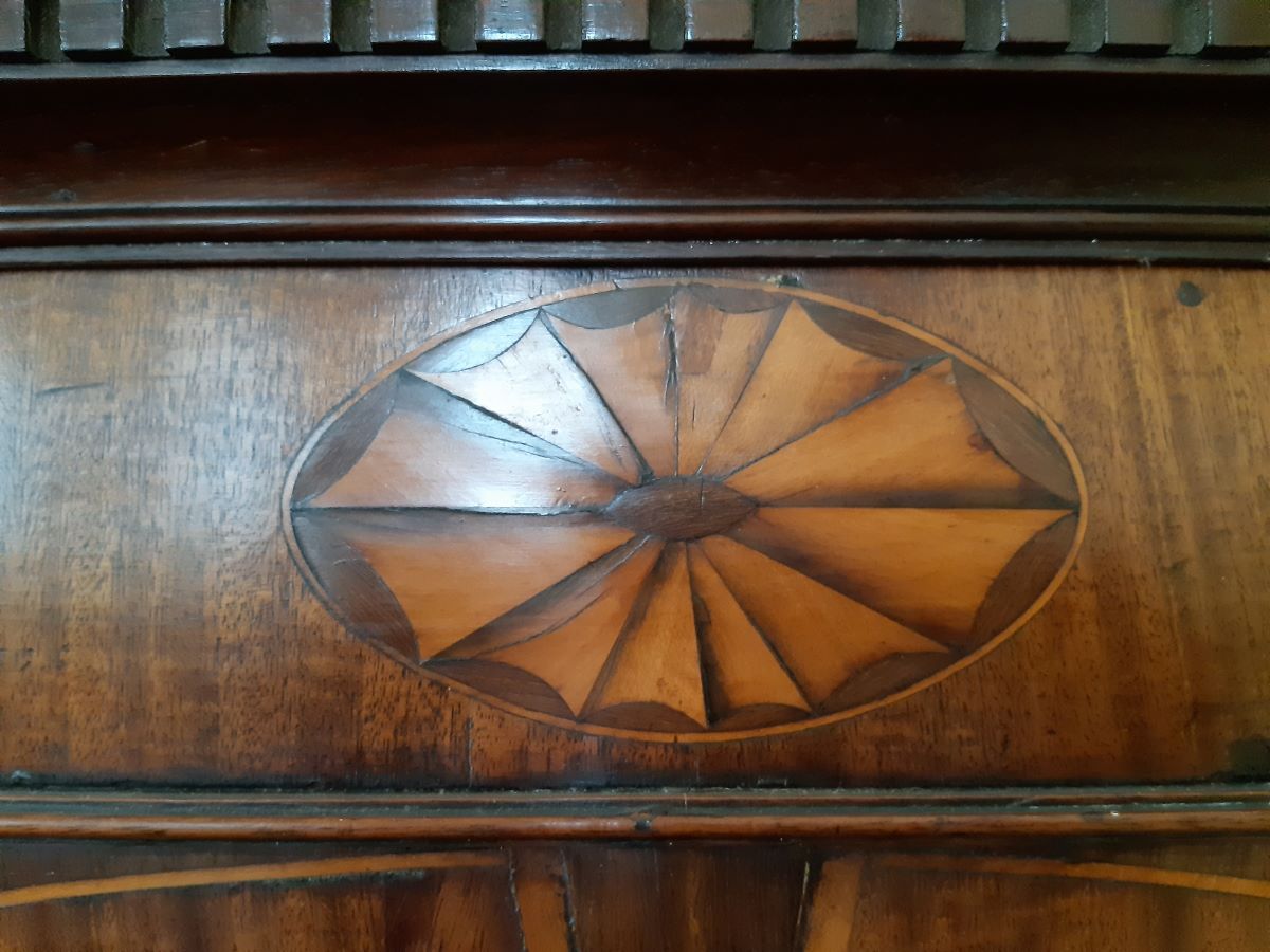 Here is a satinwood inlaid mahogany cupboard/wardrobe with two arched panelled doors. Stands on bracket feet, from the 1790's, it measures 4'2'' wide, 6'2'' high and 1'7'' deep. Good condition.