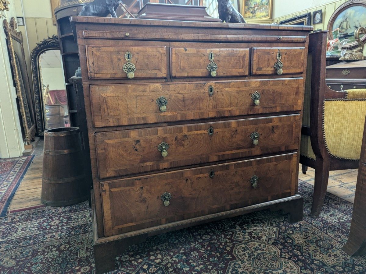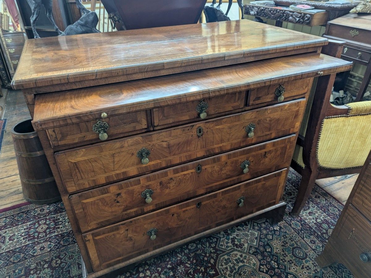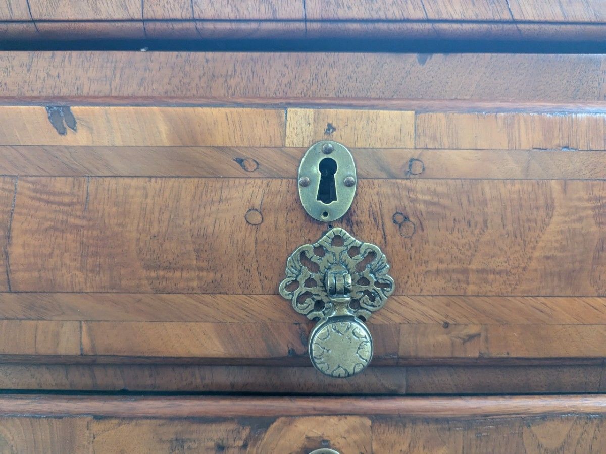 Here is a fine walnut isometric banded chest of three long and three short drawers fitted with round drop handles and brass escutcheons. As a plus, also a brushing slide fitted with two small round handles. Measures 39'' width, 20'' deep.