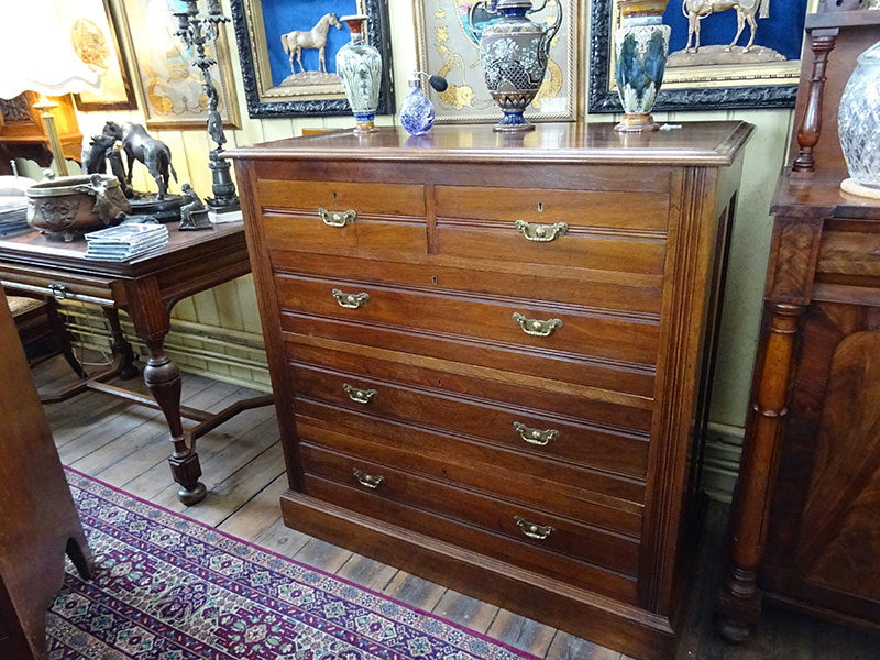 Here is an exceptional good quality walnut chest of 2 short and 3 long drawers with brass handles. Stands on a plinth base, excellent condition for its age. Measures 40'' long,19'' deep, 40'' high.