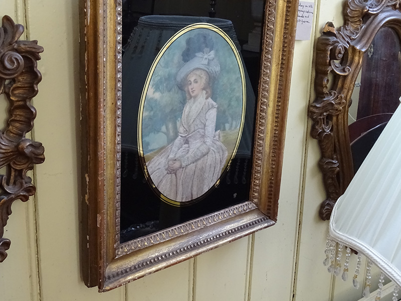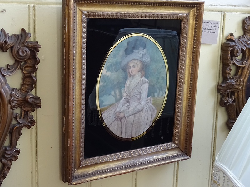 Here is a finely worked embroidery on silk, portrait of a lady in Regency costume, with painted detail to face, hands and background, set in verre eglomise mount and gilt frame typical of the early 1800's. Measures 16 inches by 13 inches. Good condition