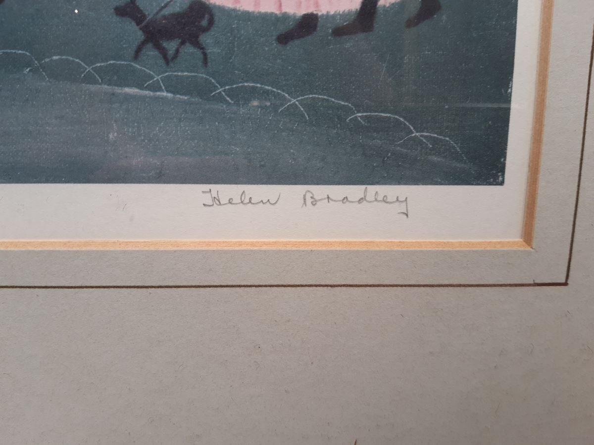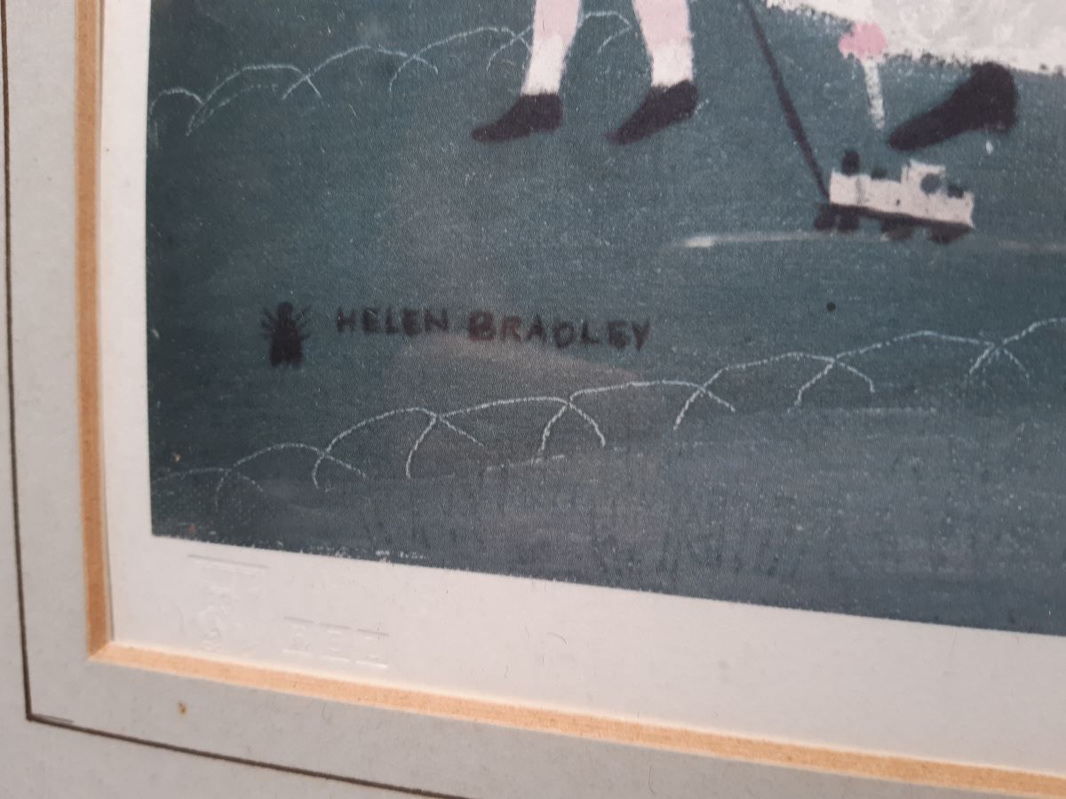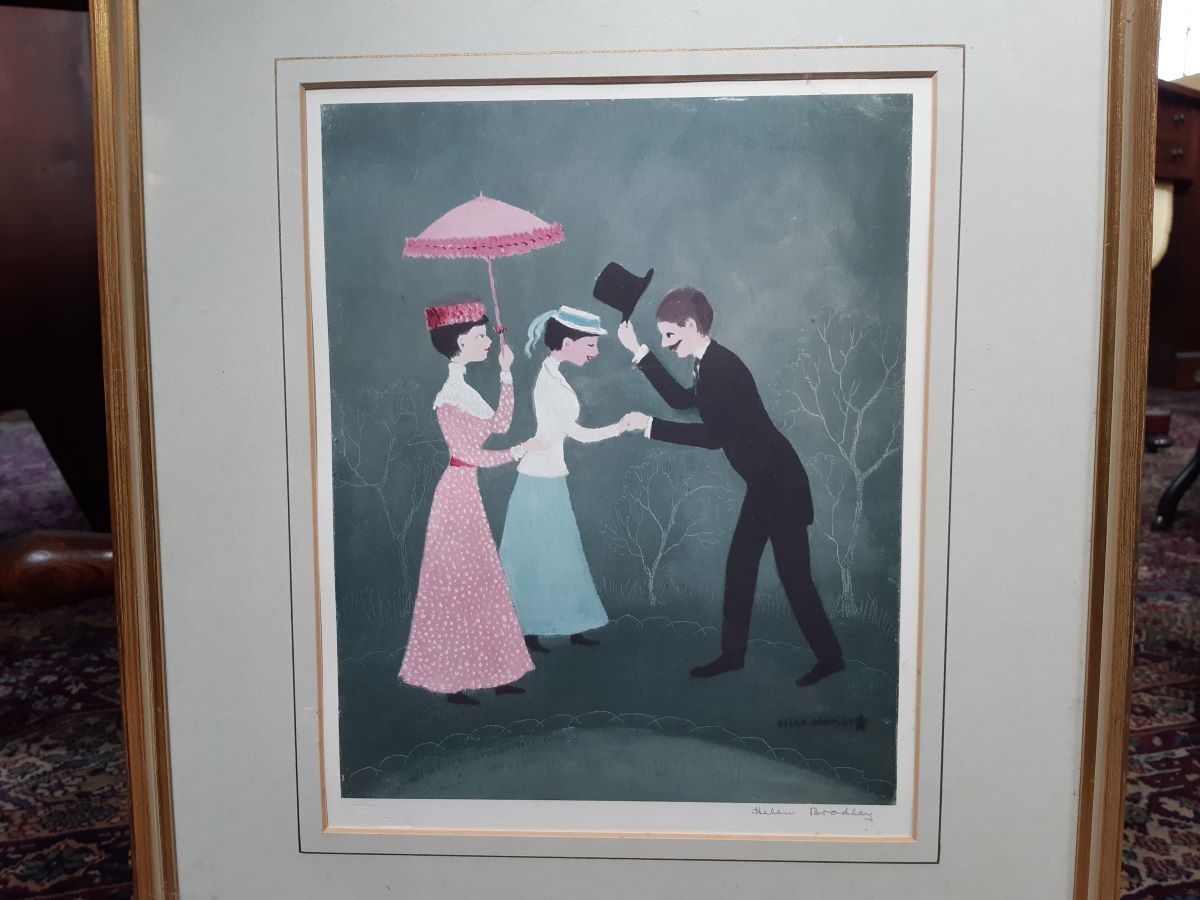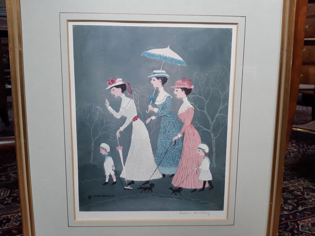 Here are a pair of coloured prints of park scenes by Helen Bradley, signed in pencil. Measurements 12'' x 9½''.