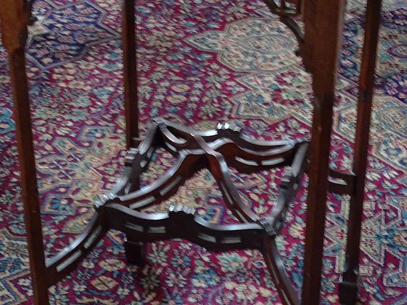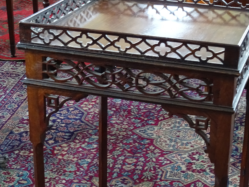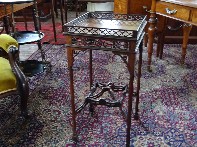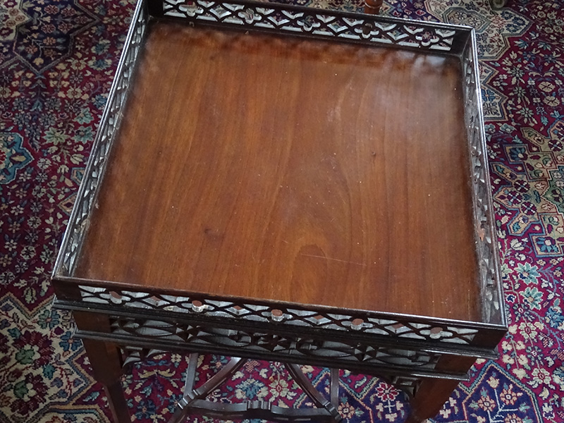 Here is a late 19th. century mahogany silver table in the Chippendale style, with a carved and pierced fretwork frieze and square tapered legs. Measures 14 inches wide and 29 inches high.