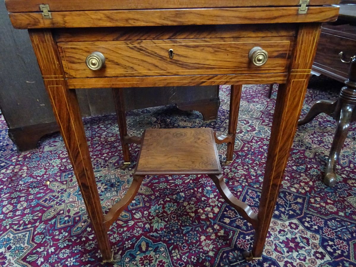 Here is a good rosewood envelope card table with 4 hinged triangular leaves enclosing a green baize surface and 4 gaming wells, above a single frieze drawer. Stands on square tapering legs with lower shelf. top inlaid with foliate scrolling. Good condition, measures 20'' square, 28'' high.