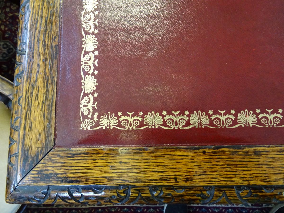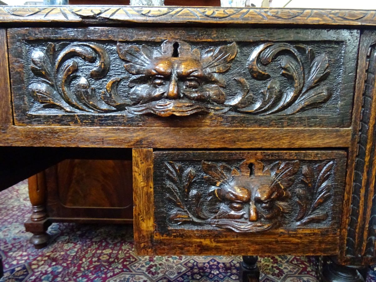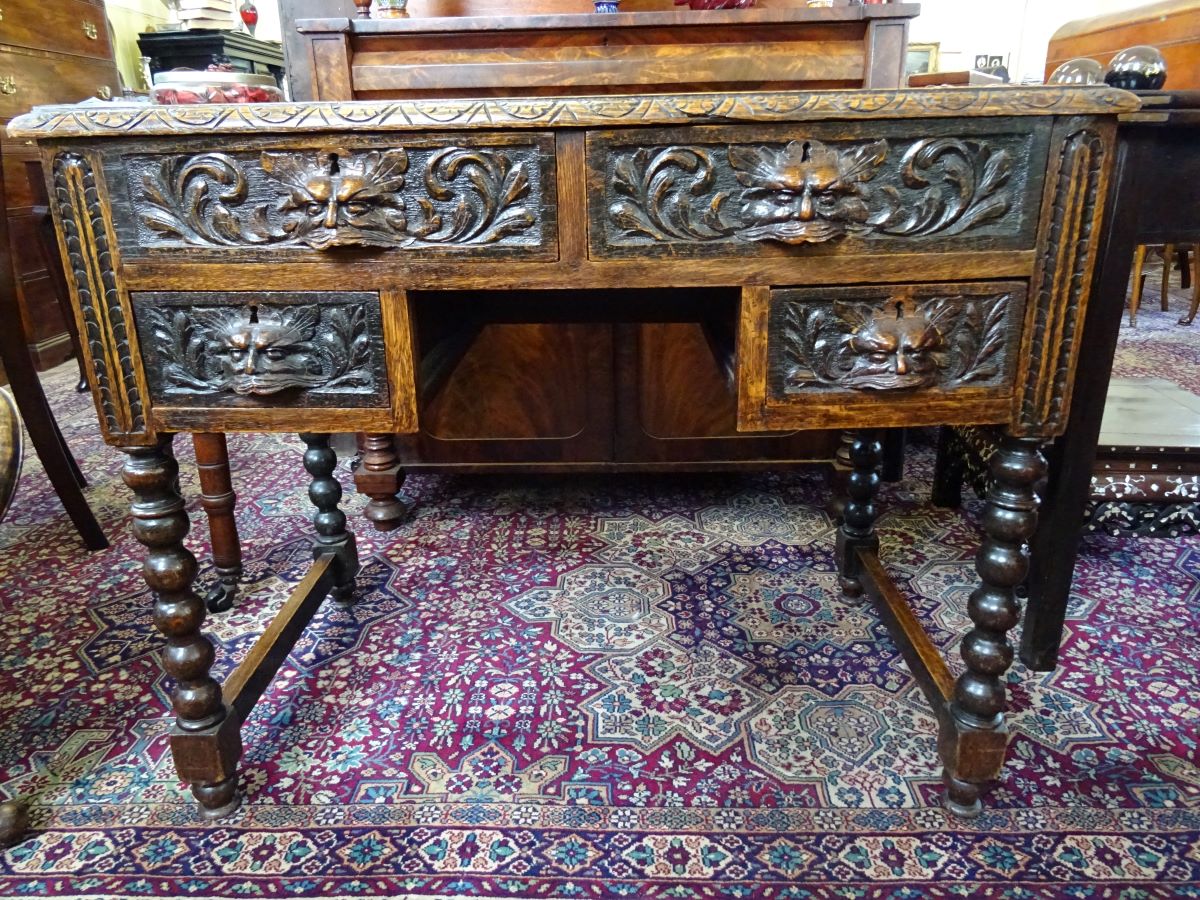 Here is an oak writing desk with carved lion mask handles and bobbin turned supports. The tooled leather top is in good condition as is the rest of the desk. Measures 38'' long & 22'' deep.