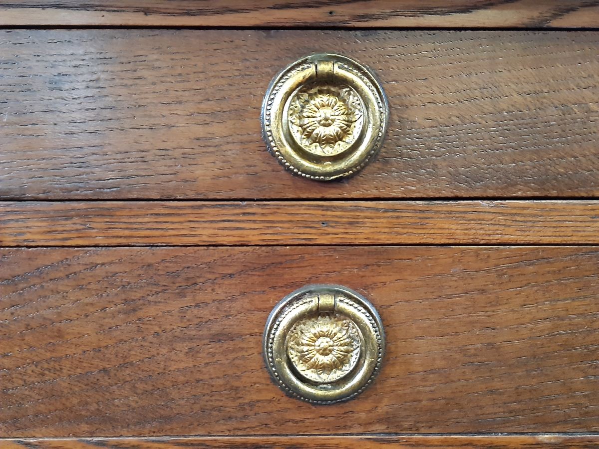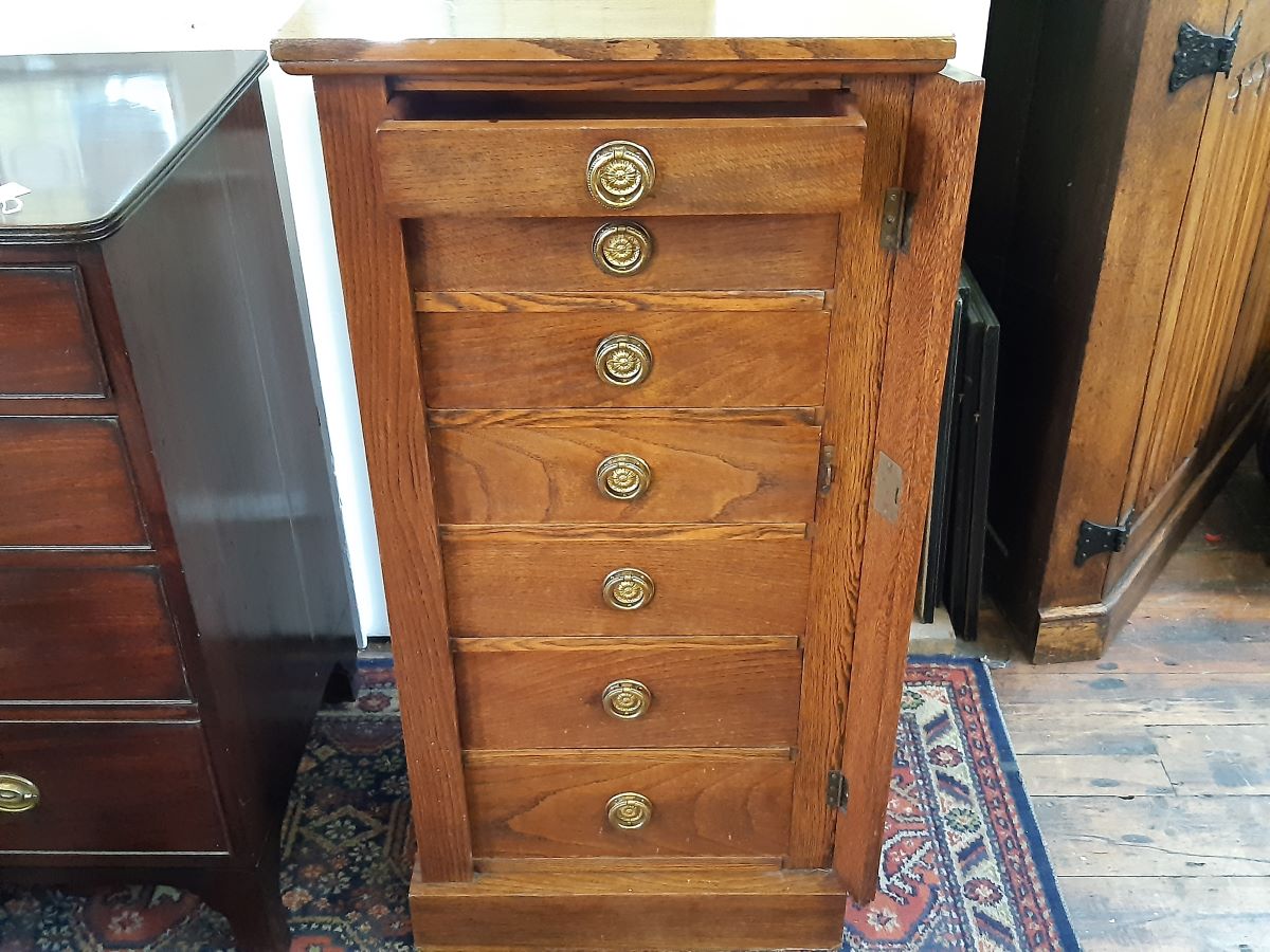 Here is an oak Wellington chest from the early 20th century. It is has seven drawers each fitted with brass handles.