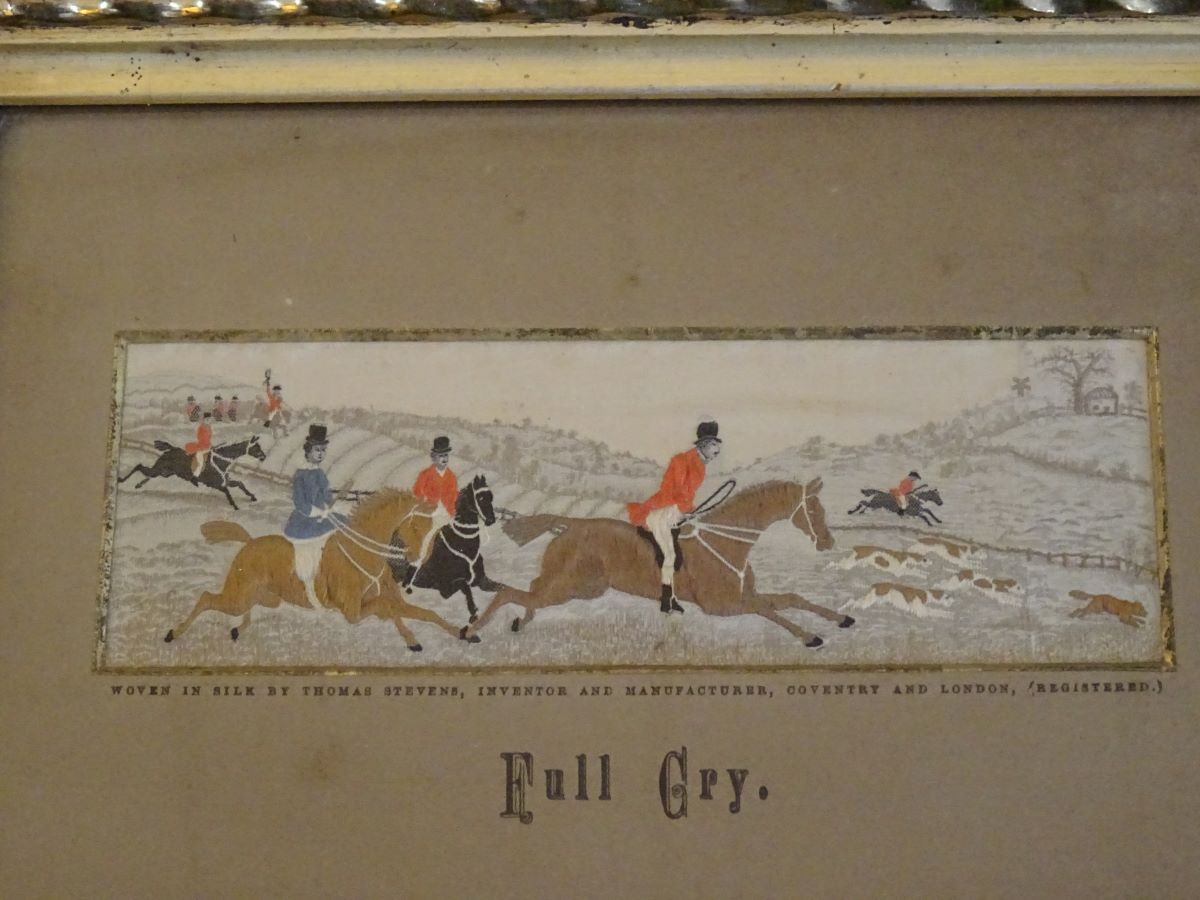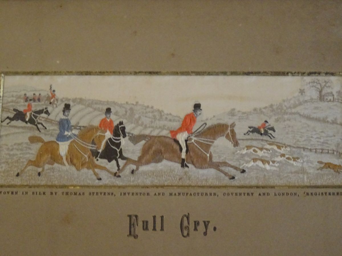 19th century stevengraph-Pair of hunting scenes, woven in silk by Thomas Stevens.