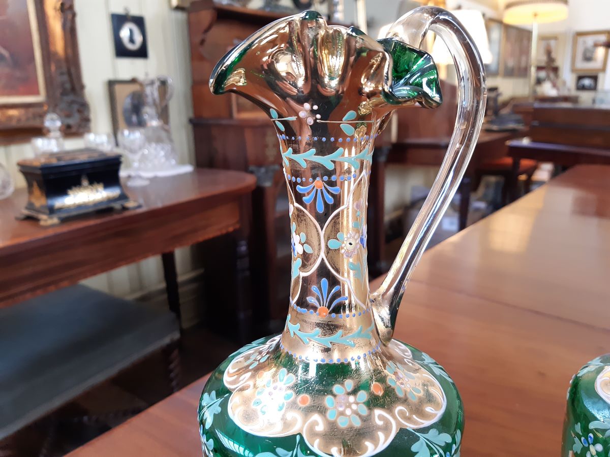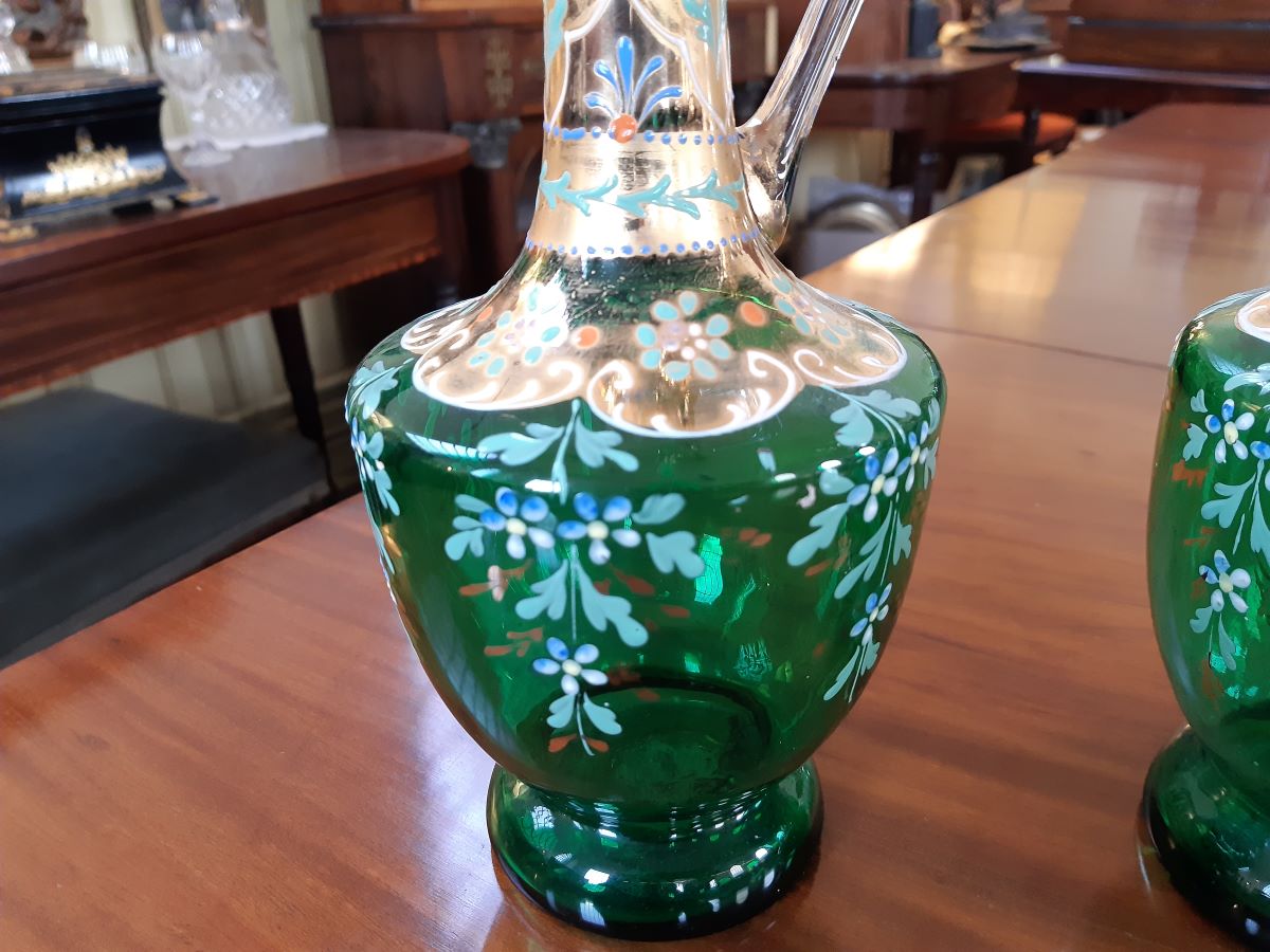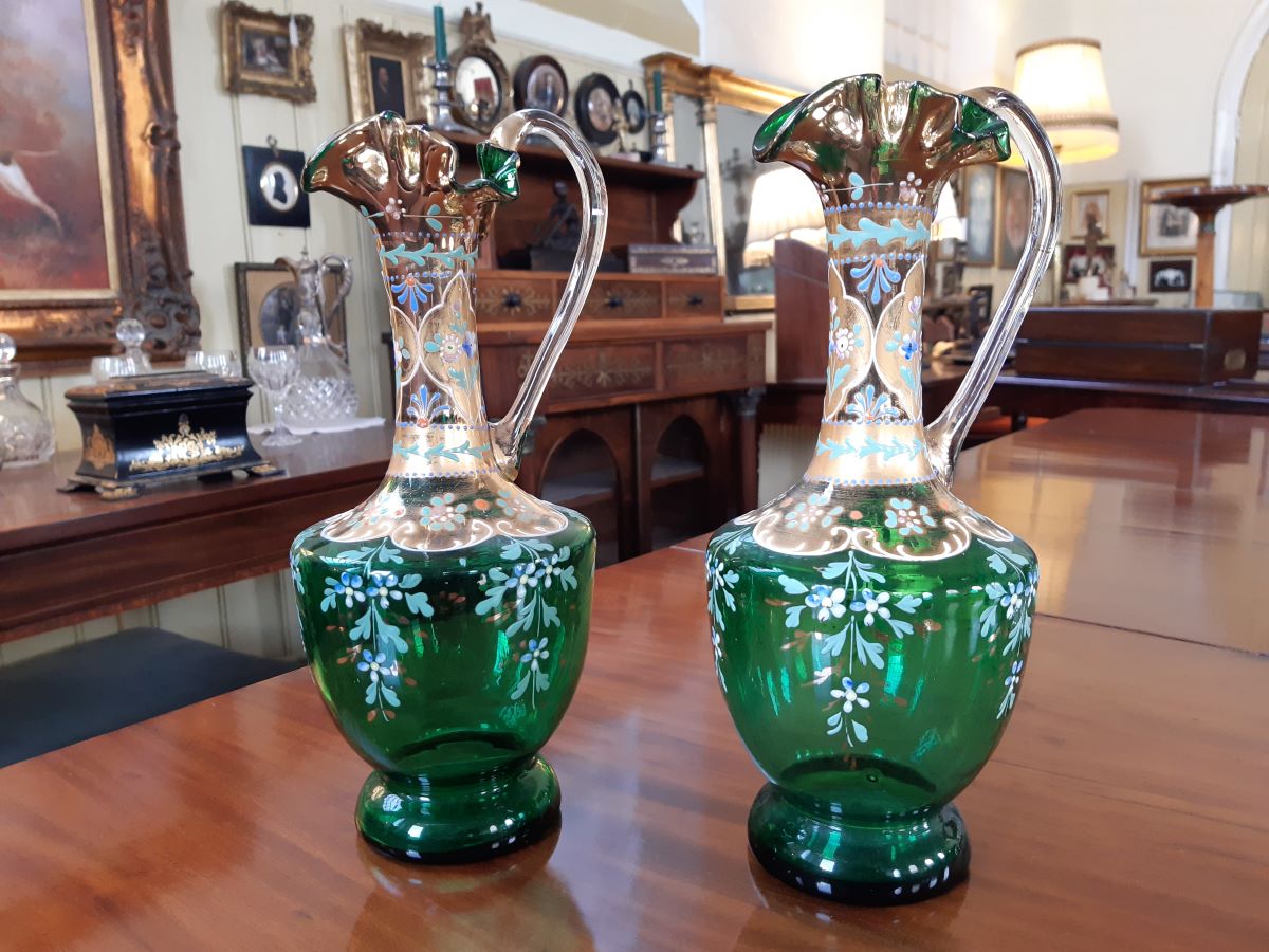Here are a pair of good green glass wine ewers, painted and gilded decoration with frilled rims. Good condition.