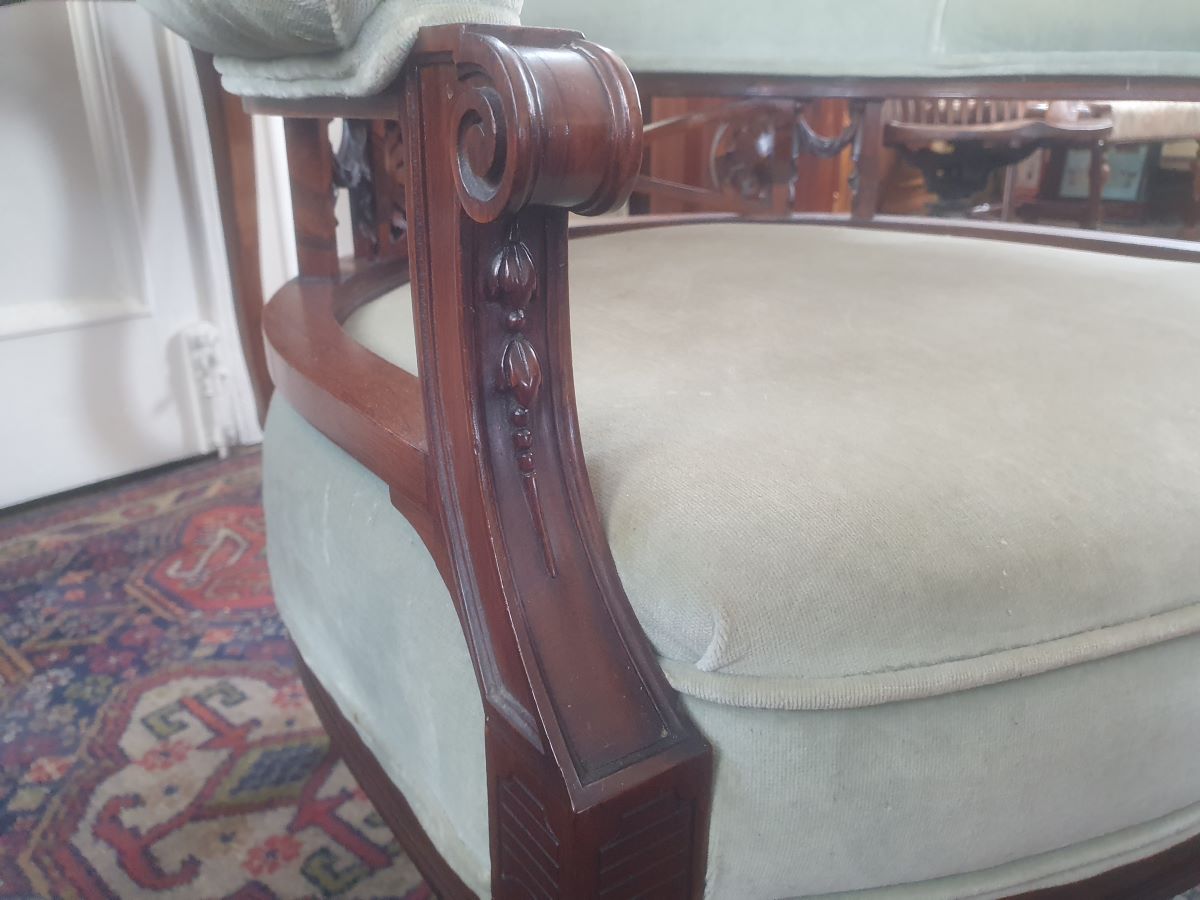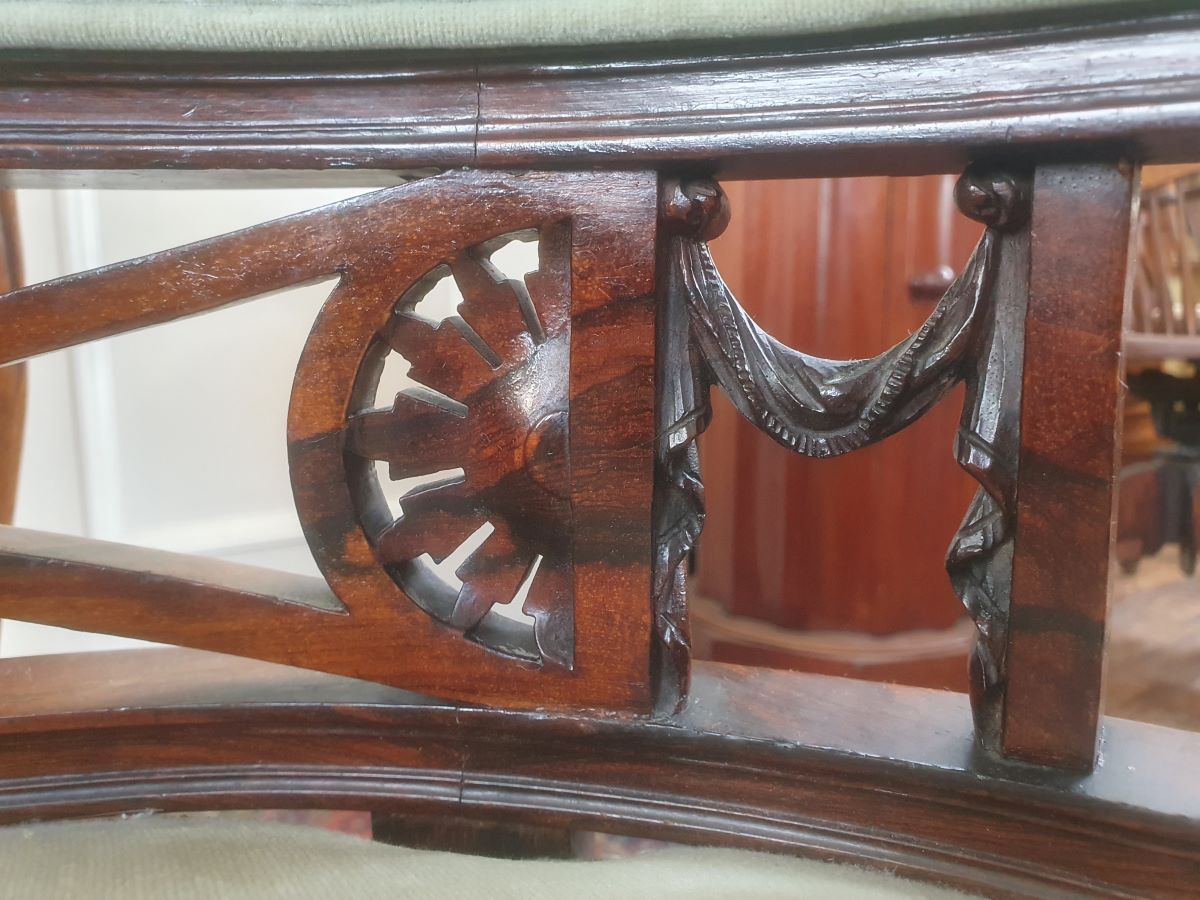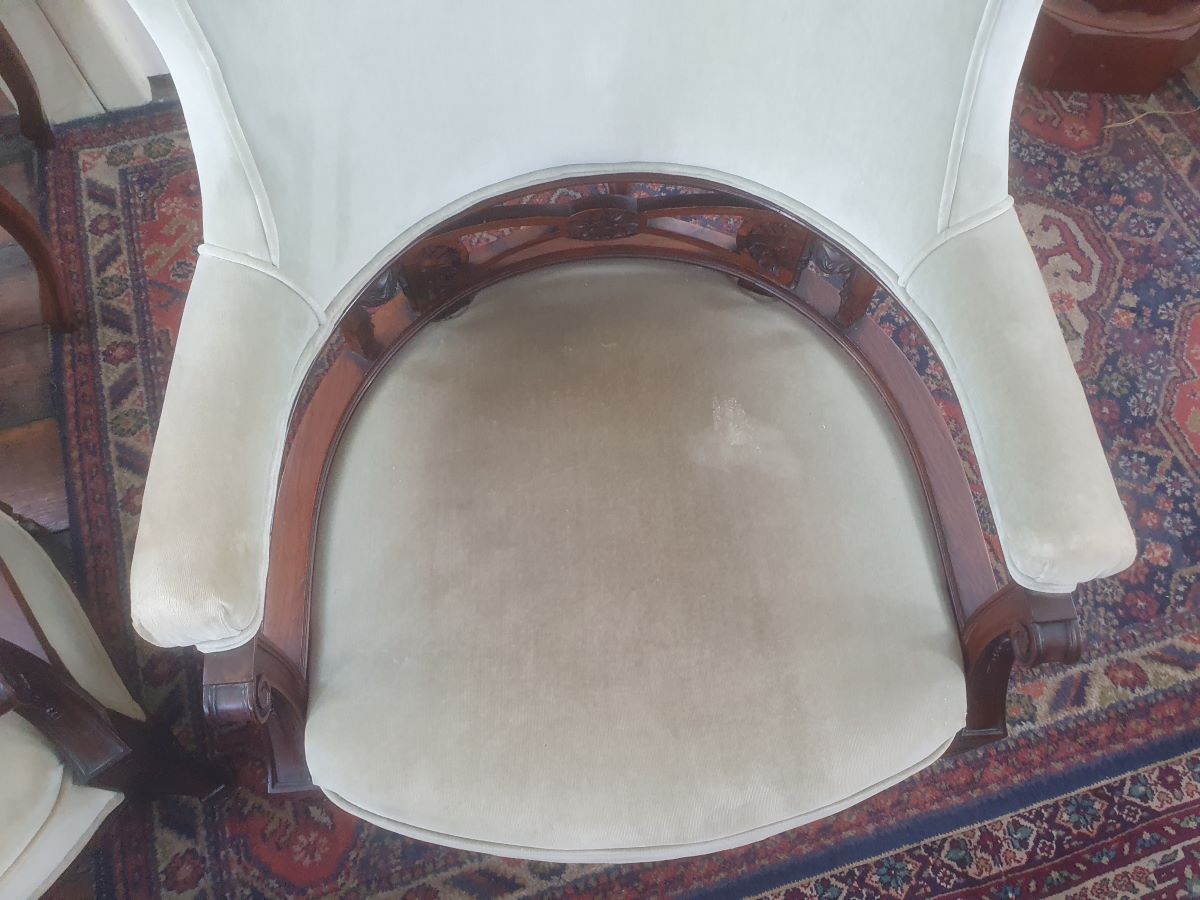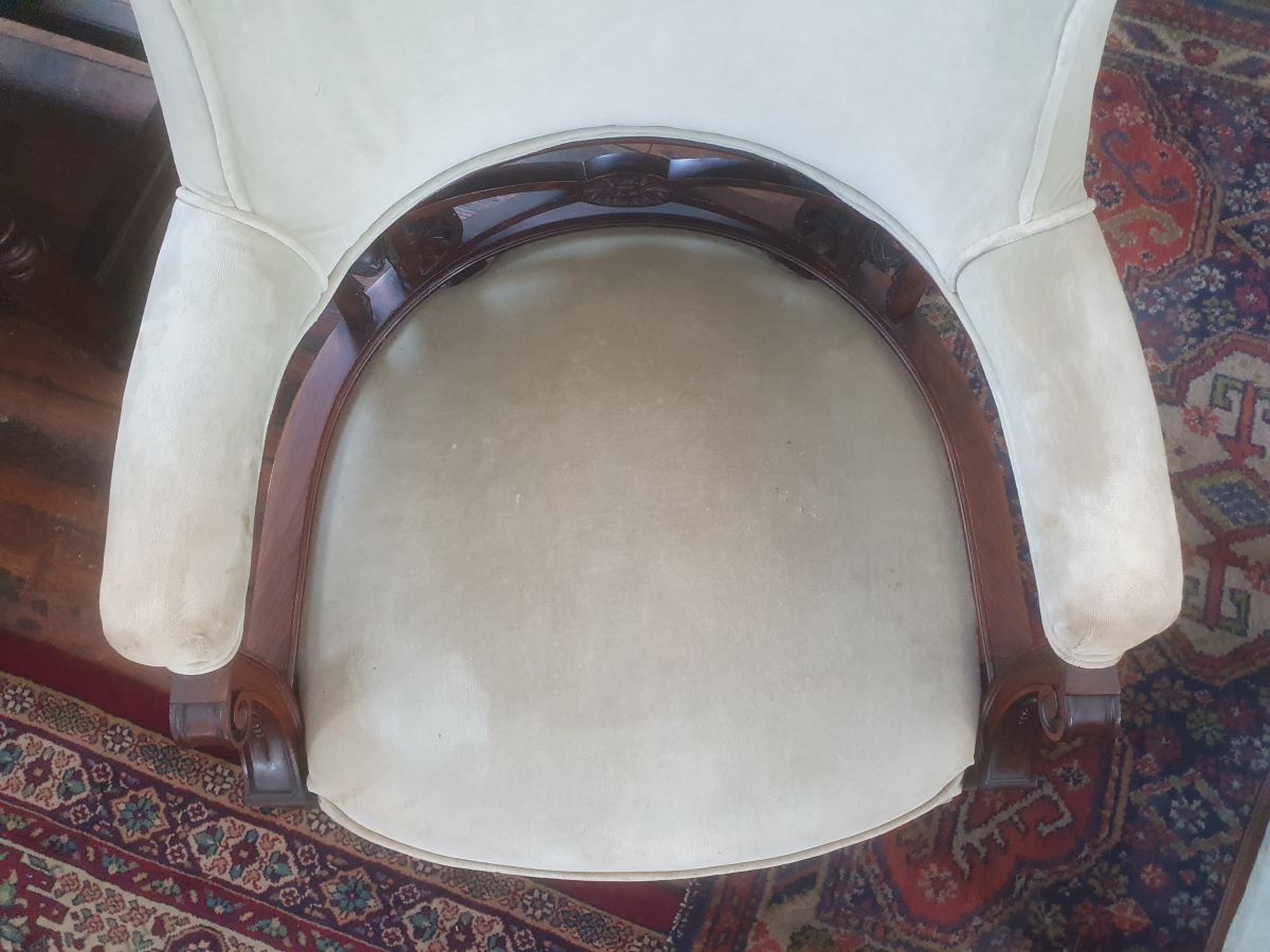 Here are a pair of good quality rosewood tub chairs, good detail and sprung upholstered seats in reasonable condition. Smaller chair measures 28½ high at back, 24'' wide. Larger chair measures 31'' high at back, 26'' wide.