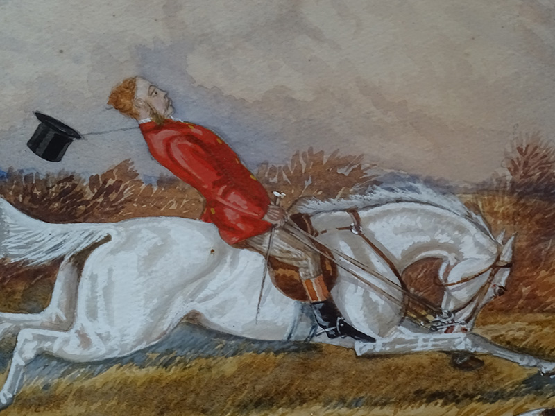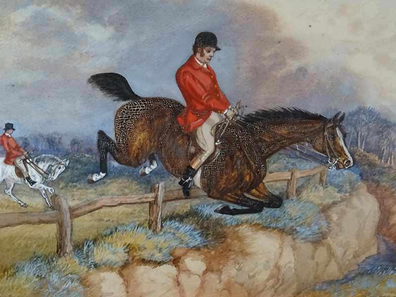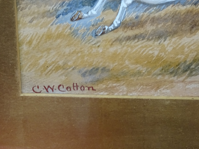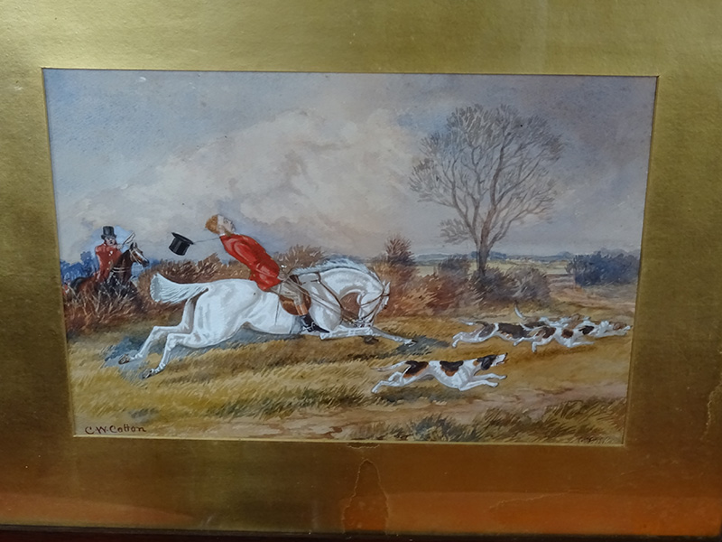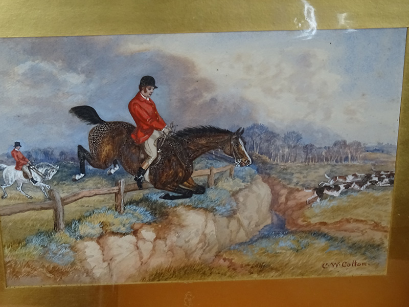 Here are a pair of water colours depicting hunting scenes from the 19th. century in original oak frames. Both signed C. W. Cotton. Frames measure 22.5 inches by 18 inches.
