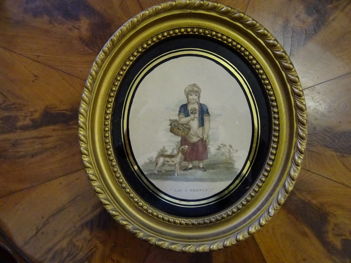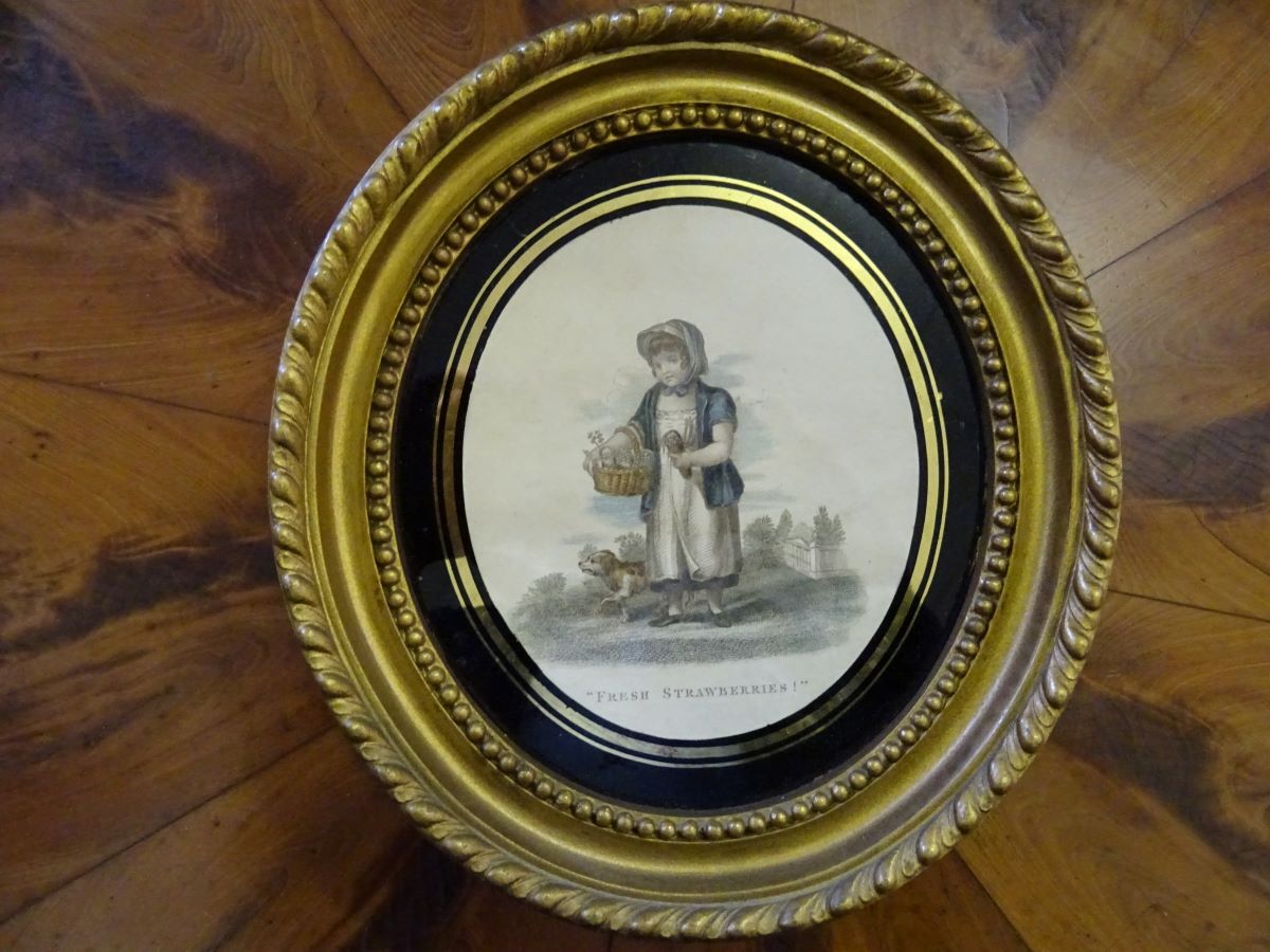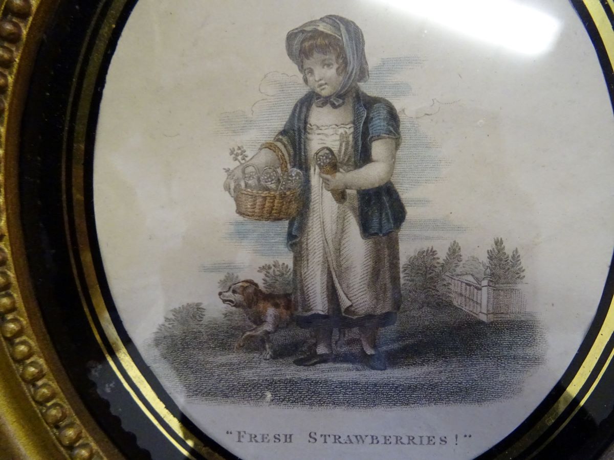 Here are a pair of gilt framed engravings of young flower girls, one selling strawberries the other lavender, both in glass gilded mounts. Frames measure 9''x 8.25''.