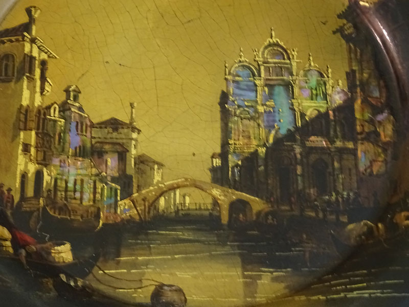 Victorian papier mache round tray, inlaid with mother of pearl.