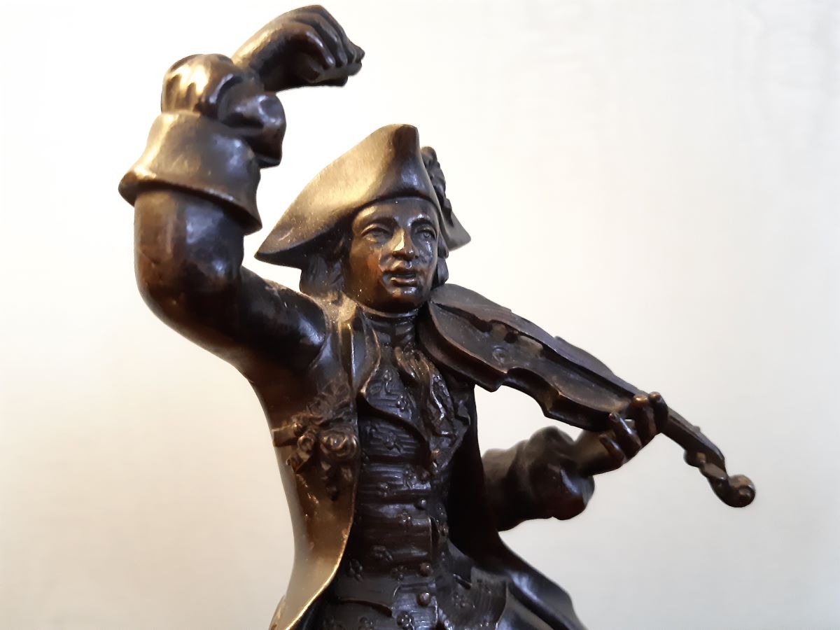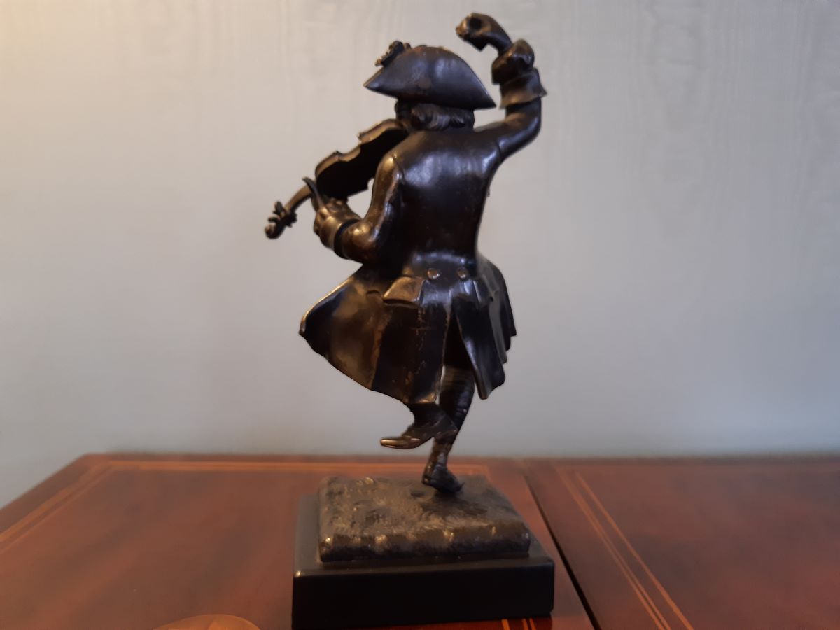 • Patinated bronze sculpture of man playing a violin on black marble plinth