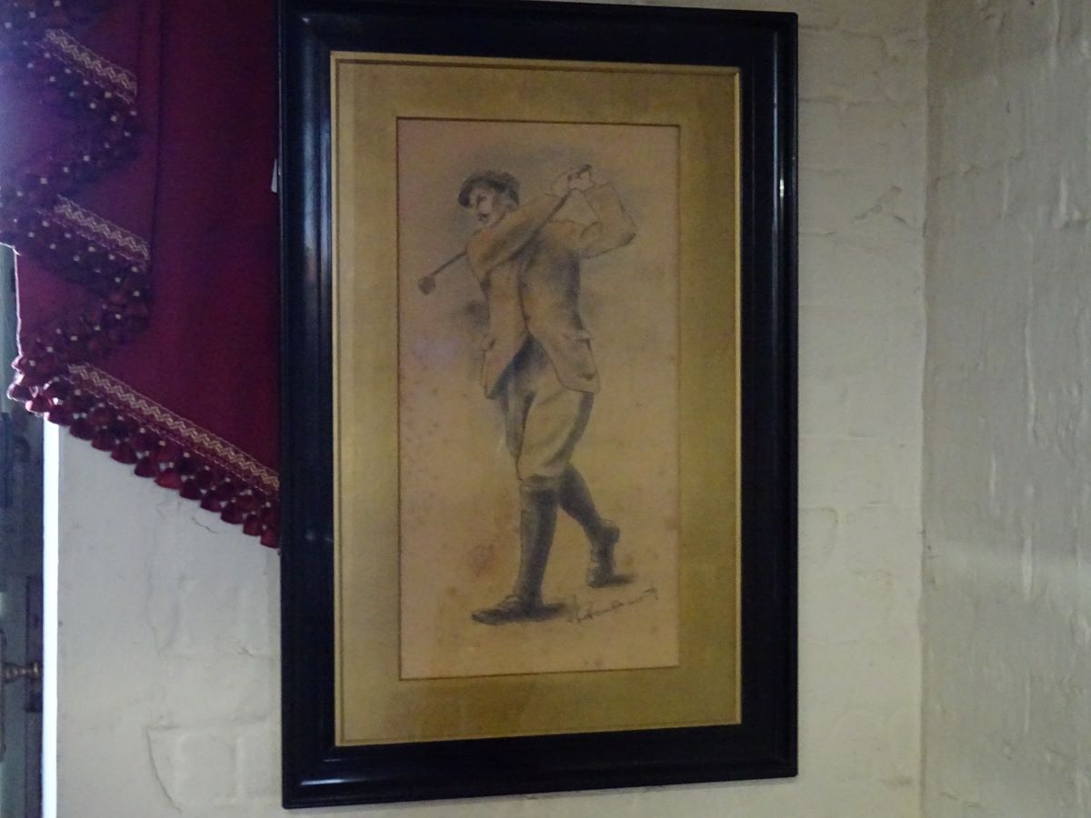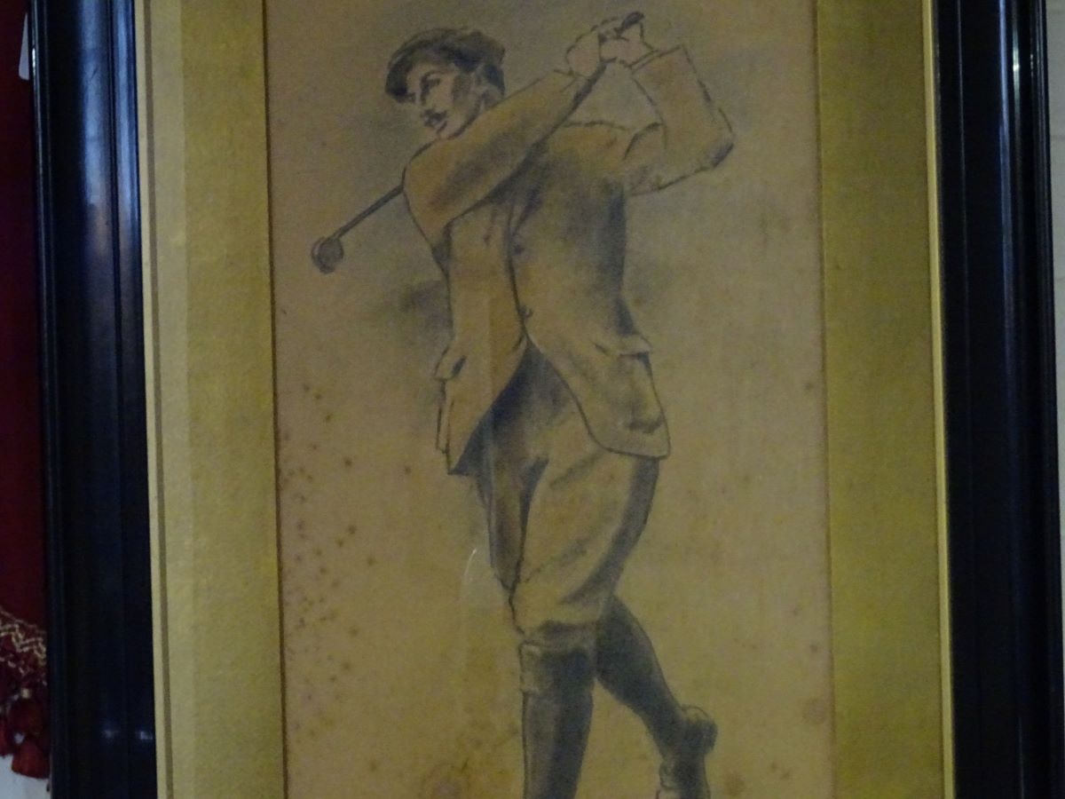 Here is a portrait, pencil and crayon, of golf champion Harry Vardon encased in an ebonized frame. Measures 32'' x 22''. C.1910. Some foxing.
