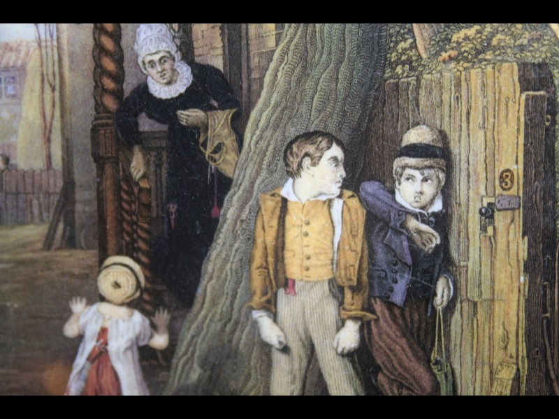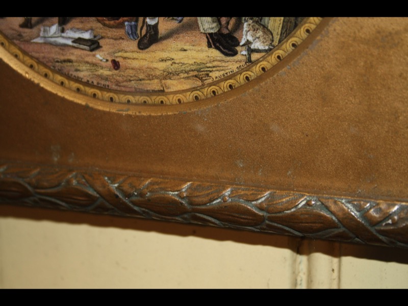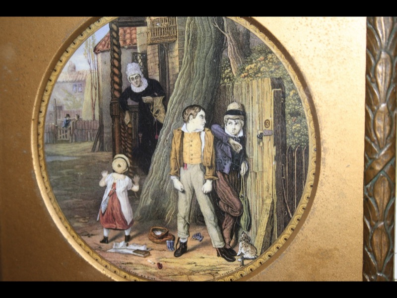 19th century Prattware plaque-'The Truant' after Irish artist Mulready. Encased in a gilt metal frame measuring 9 inches x 9 inches.