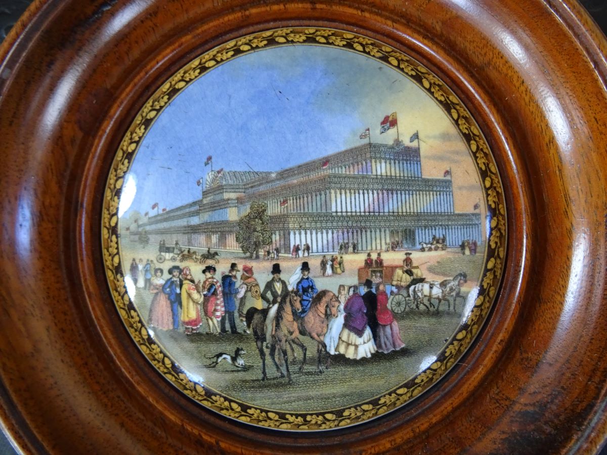 Here is a rare 19th century Prattware polycrome pot lid, exterior view of Crystal Palace. Diameter of turned wood frame 7 inches. Good condition.