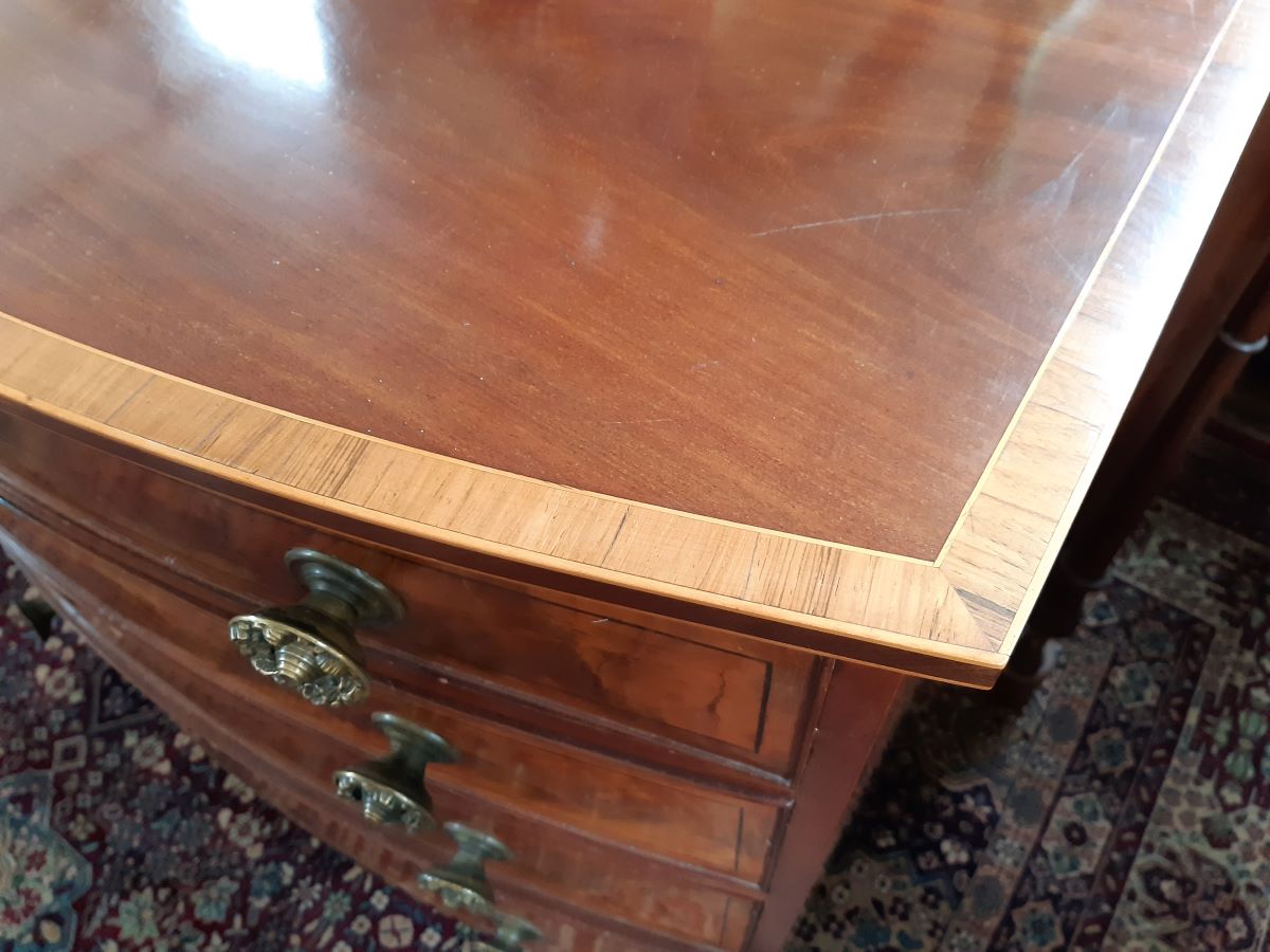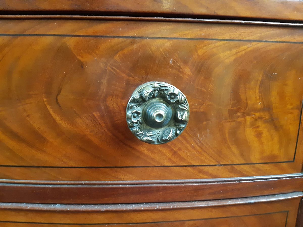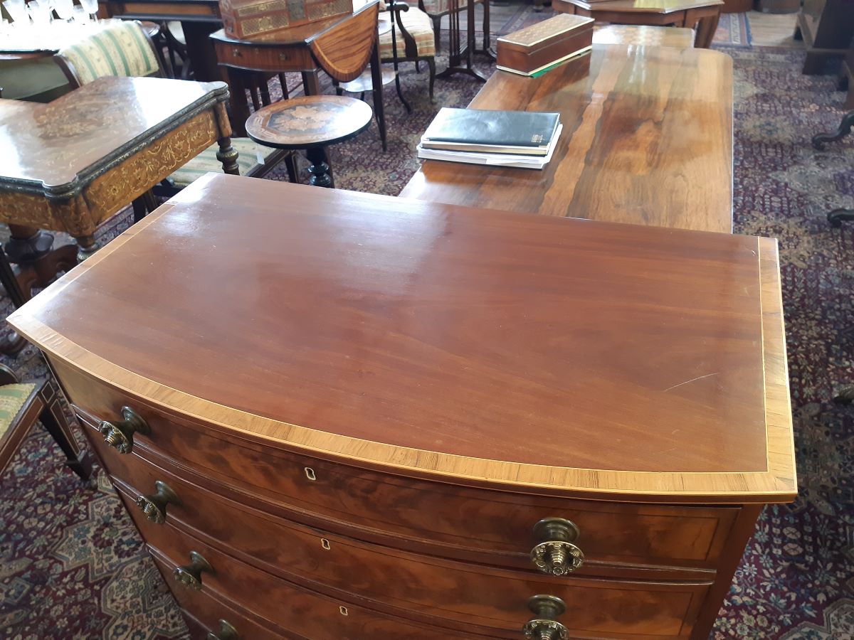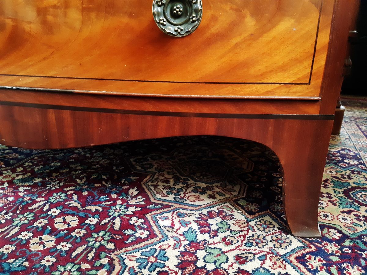Here is a good mahogany bow-front chest of 4 long graduated drawers, with rosewood cross banding and original embossed brass handles. Length 38'', Depth 22'', Height 35''