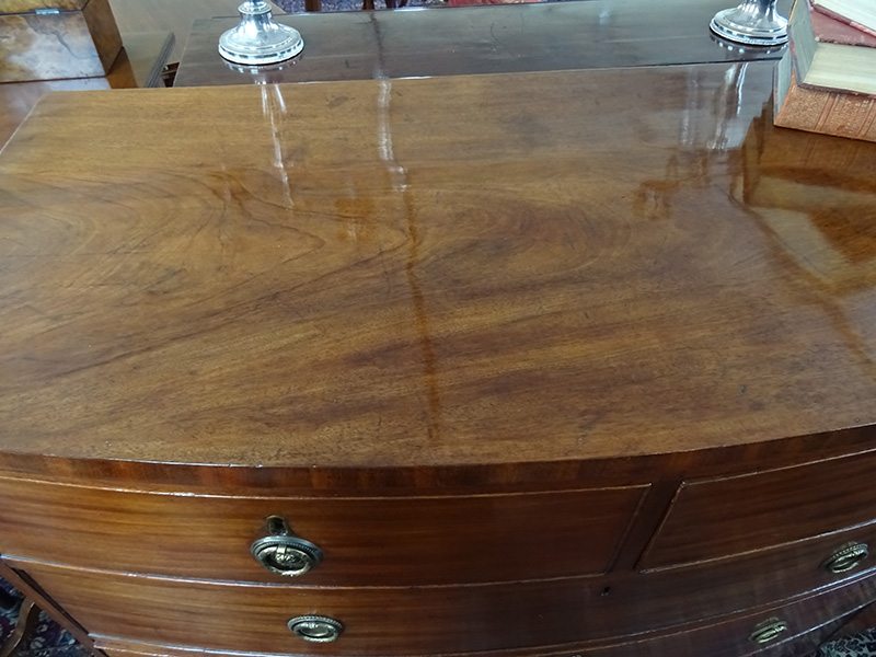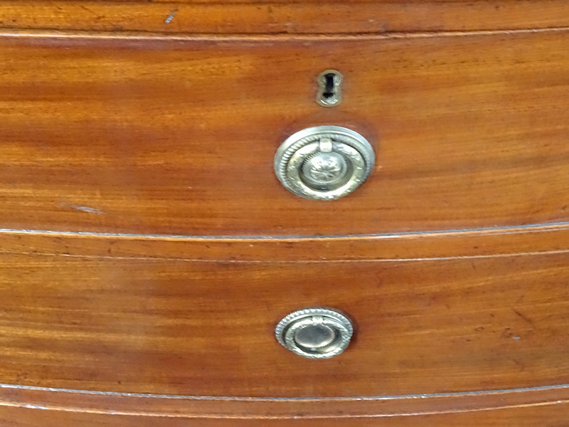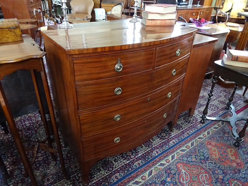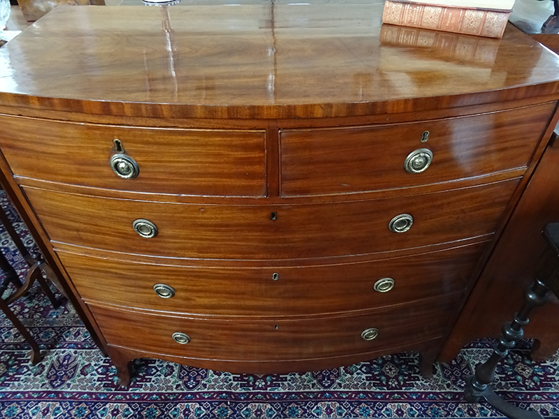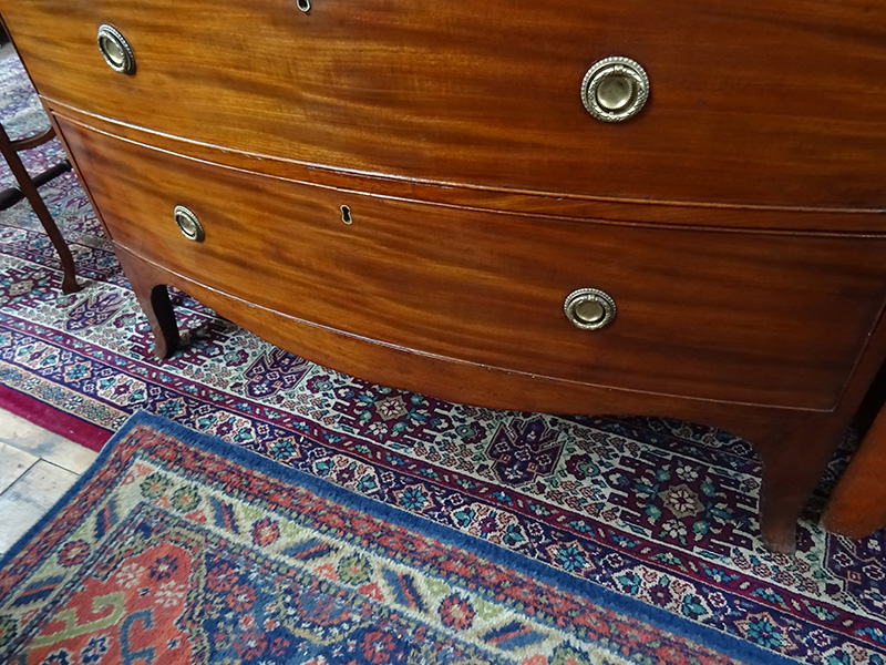 Here is a fine quality Regency bowfront chest of two short and three long drawers with brass ring handles, standing on splayed bracket feet. Measures 42 inches wide, 21 inches deep, 41 high. Amazing condition for the age.