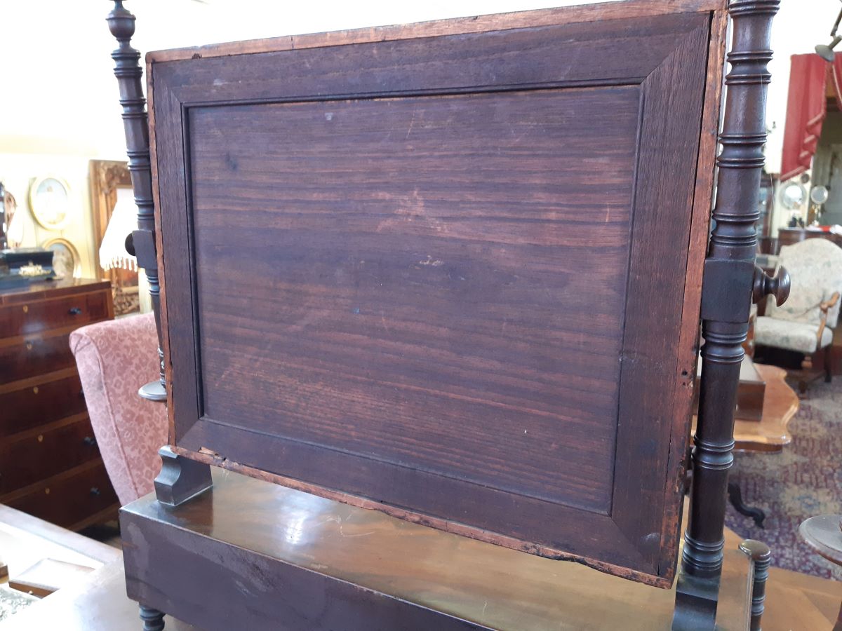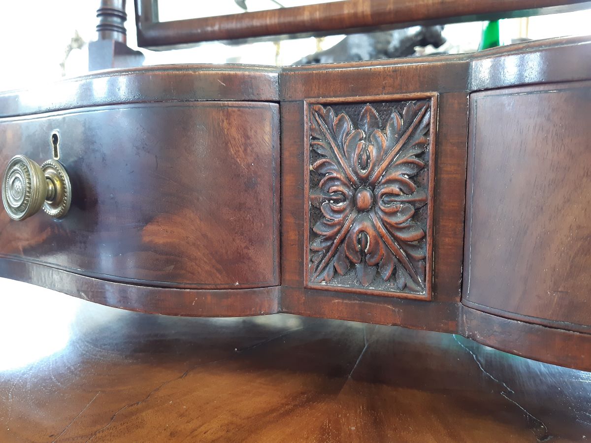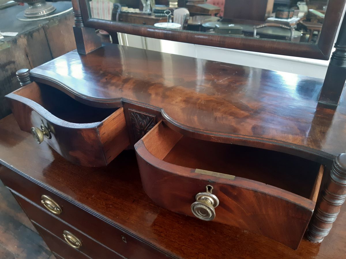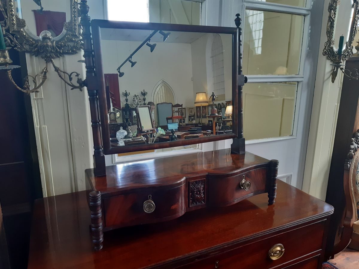 Here is a mahogany double serpentine-front, box swing toilet mirror with two short drawers. Measures 2' wide & 2'1'' high.
