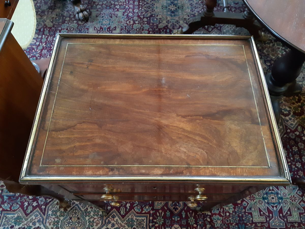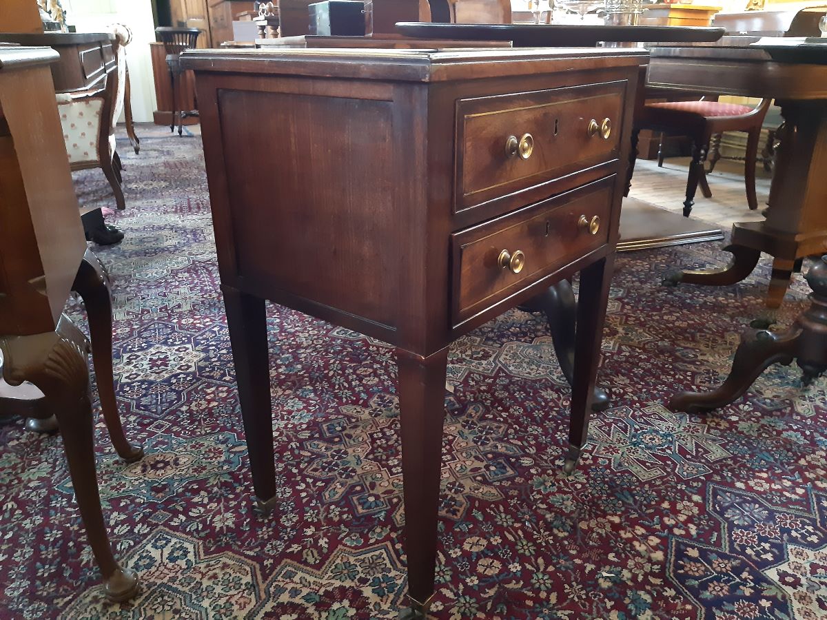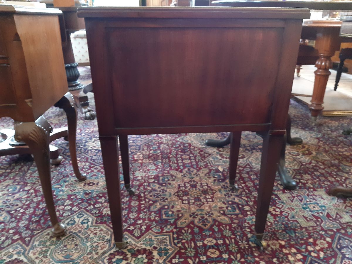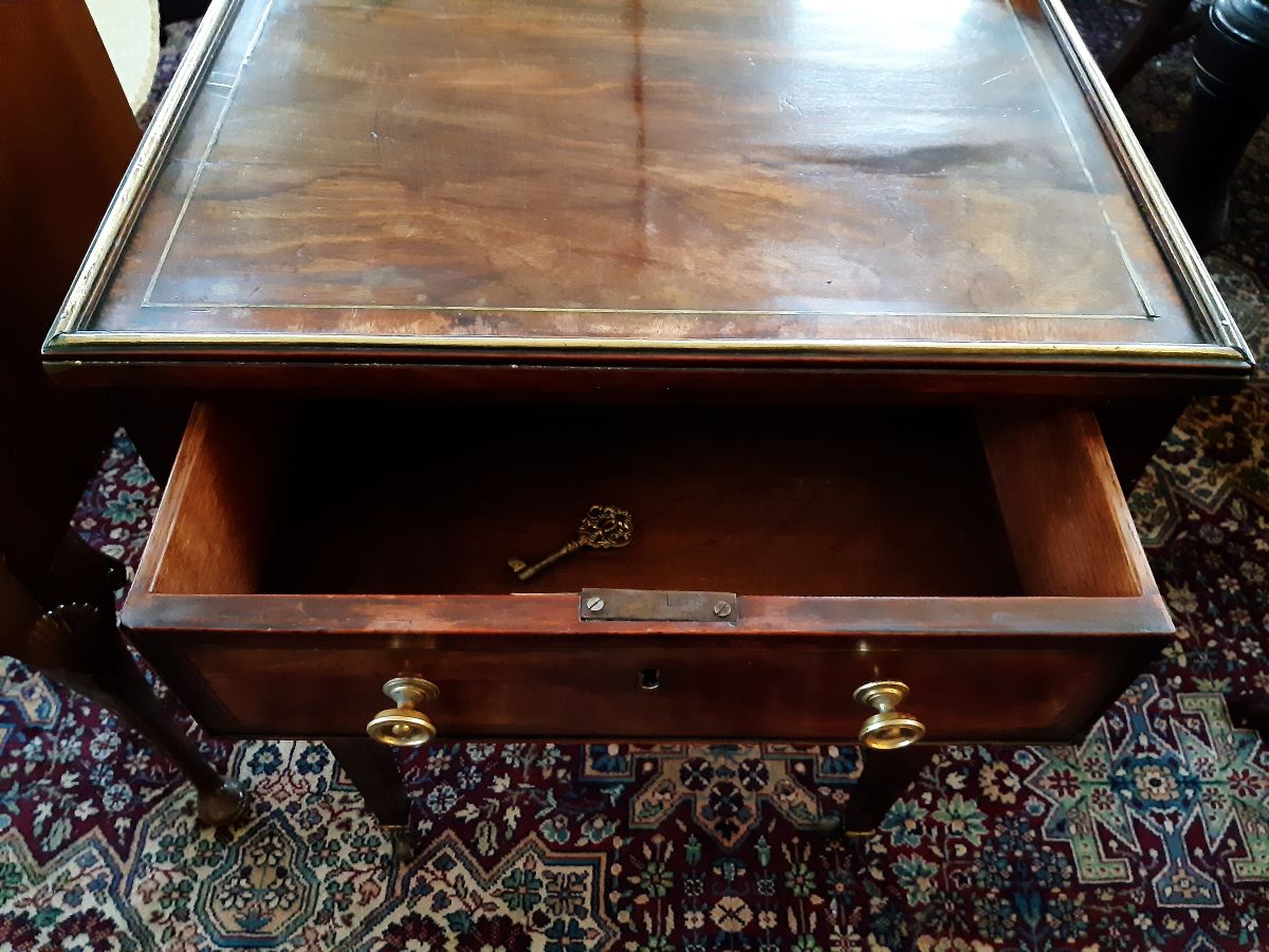 Here is a good two drawer side table, rosewood, tapered legs on castors and inlaid brass banding. Measures 20'' wide, 15'' deep, 28'' high.