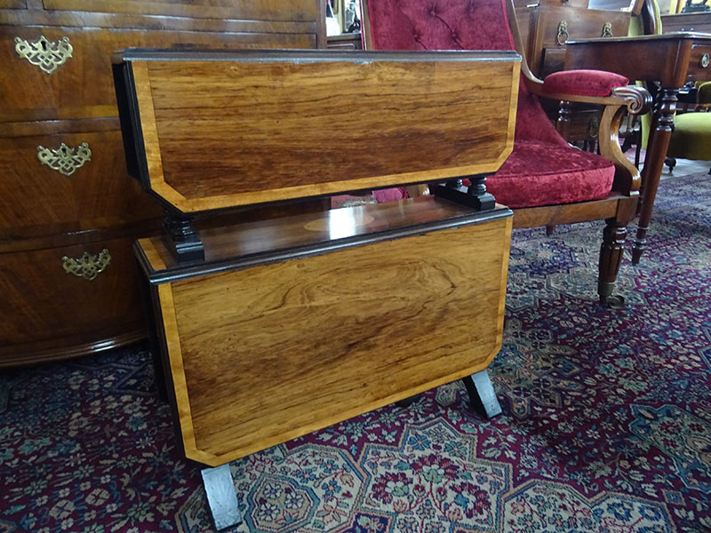 Here is an unusual rosewood double Sutherland table, inlaid with banding and shell motif in centre. Measures 23 inches long, 25.5 inches high, 6 inches wide.