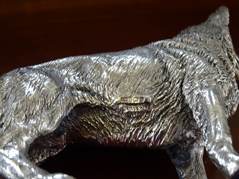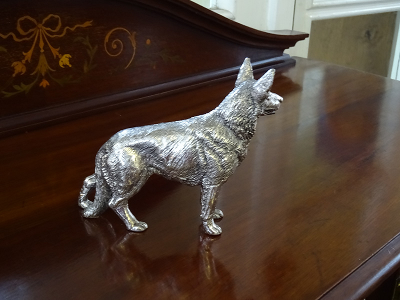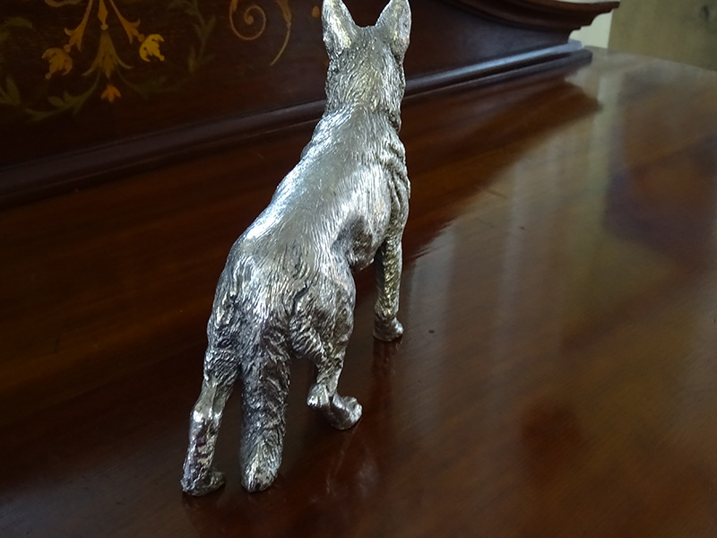 Here is a filled silver figure of an Alsatian, by the renowned firm of Mappin & Webb, with Birmingham assay mark but indistinct date latter. Good condition and measures approximately 5 inches long and 4 inches high.