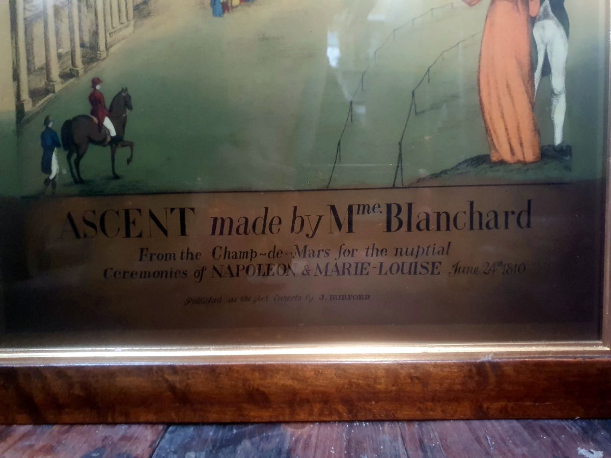 The hot air balloon ascent made by Madame Blanchard from the Champs De Mars for the nuptial ceremonies of Napoleon and Marie-Louise, June 24th 1810, published by J Burford. Measures 27'' x 20½''